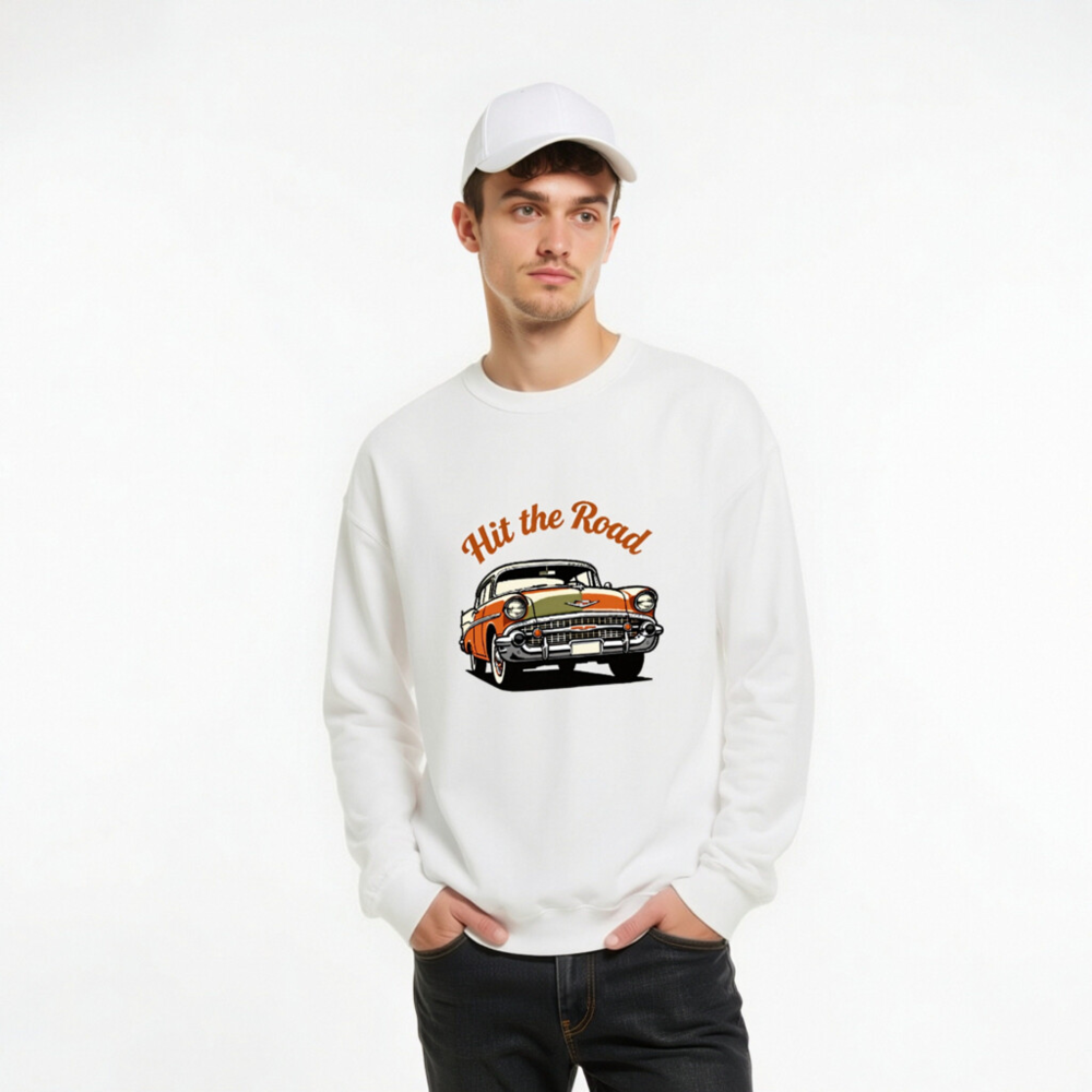 Unisex Hit the Road Classic Car Sweatshirt – Vintage Orange & Green Crew Neck