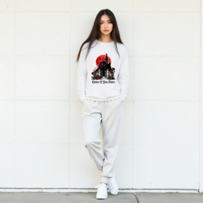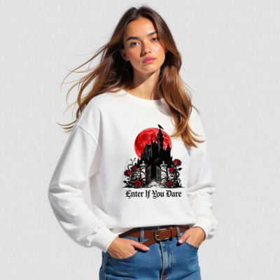 A unisex long sleeve tee featuring a striking gothic castle silhouette against a blood-red moon, adorned with red roses and thorny vines. The bold phrase ‘Enter If You Dare’ adds eerie charm—perfect for Halloween, horror fans, or dark aesthetic lovers. Made from soft, comfortable fabric for everyday wear. Ideal for spooky season or as a statement piece in your alternative wardrobe.