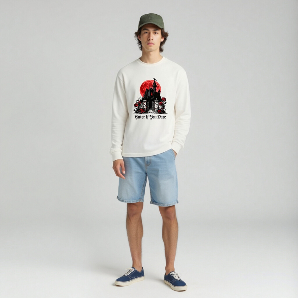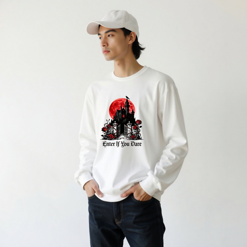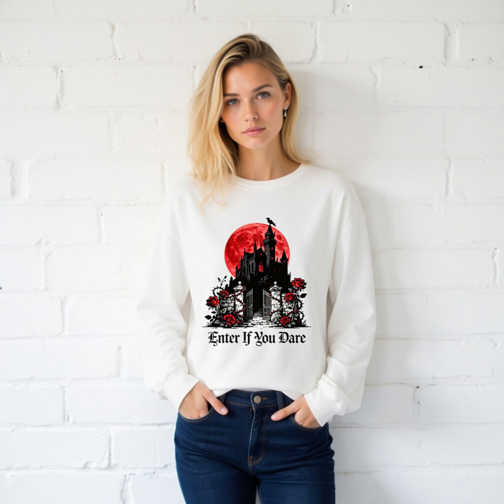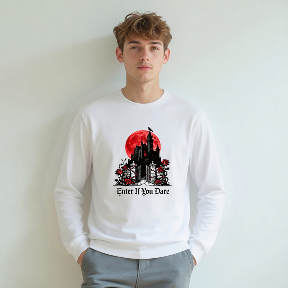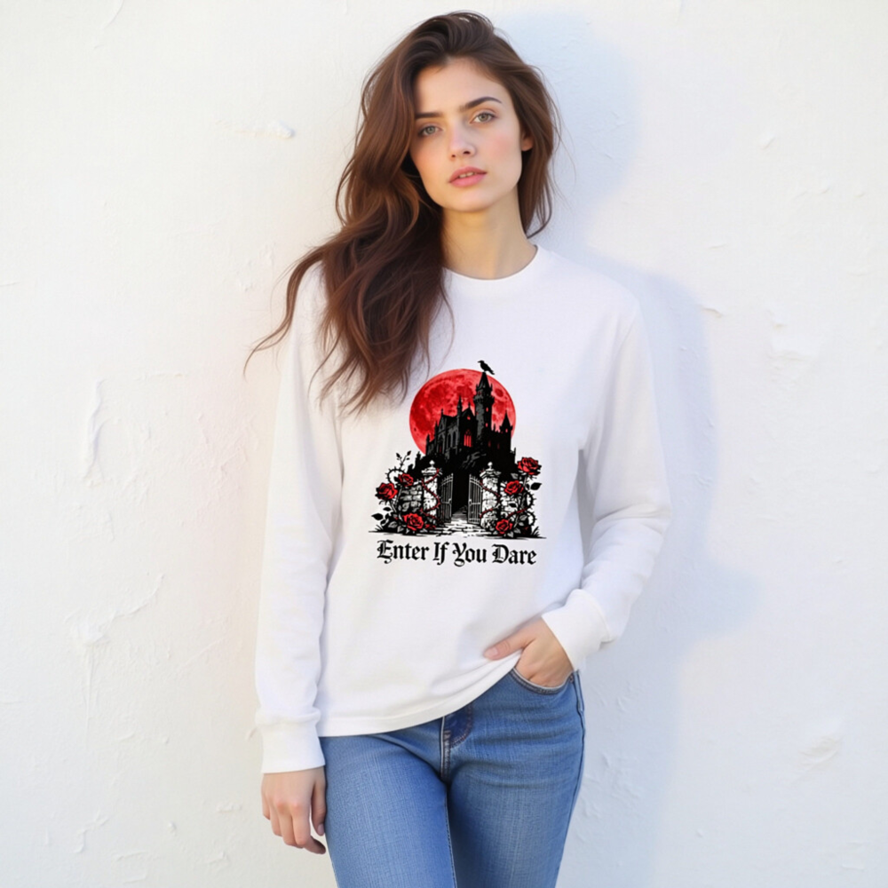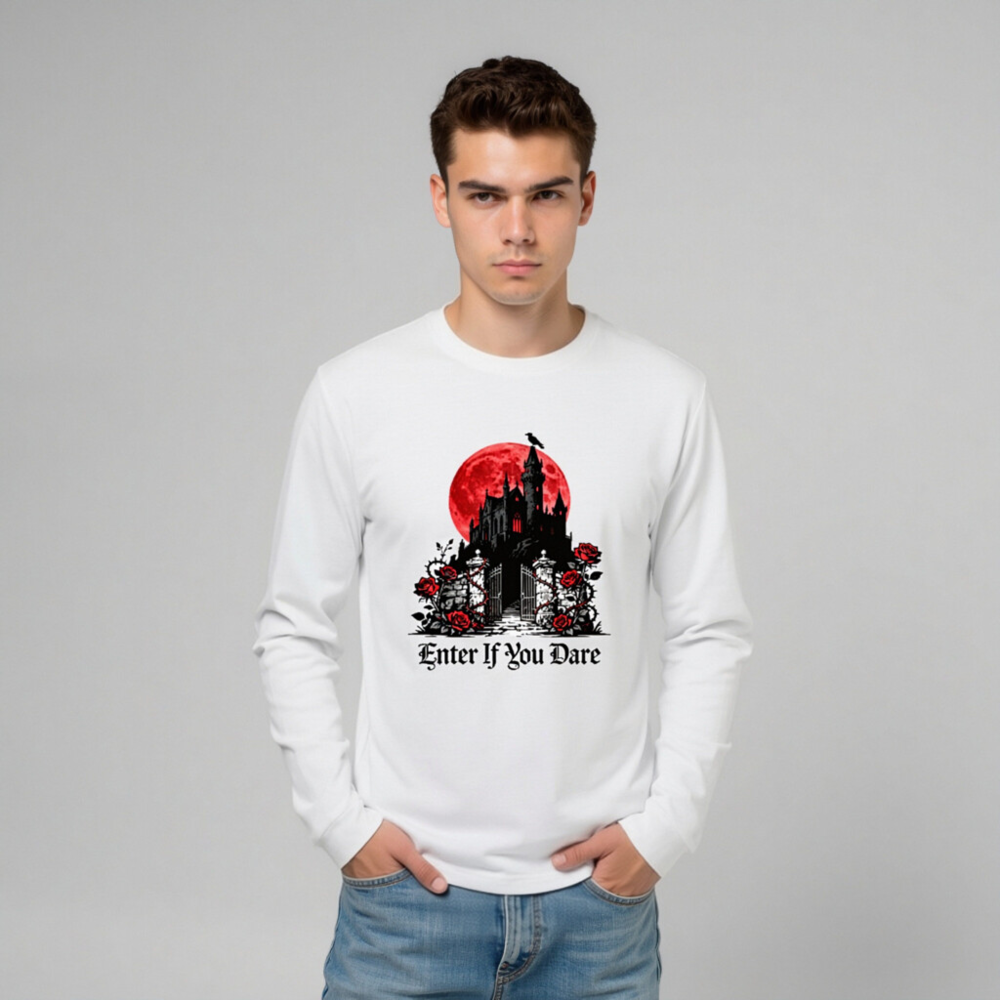 A unisex long sleeve tee featuring a striking gothic castle silhouette against a blood-red moon, adorned with red roses and thorny vines. The bold phrase ‘Enter If You Dare’ adds eerie charm—perfect for Halloween, horror fans, or dark aesthetic lovers. Made from soft, comfortable fabric for everyday wear. Ideal for spooky season or as a statement piece in your alternative wardrobe.
