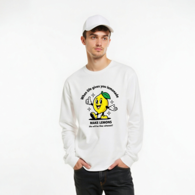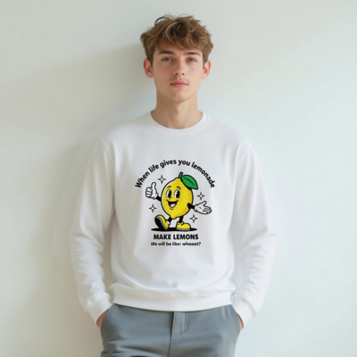 Bright, cheerful unisex long sleeve tee featuring a smiling lemon mascot with thumbs-up and open arms. Bold text reads: ‘When life gives you lemonade, MAKE LEMONS — life will be like: whaaat?’ Perfect for casual wear, humor lovers, and lemon-themed fans. Soft cotton blend, relaxed fit, versatile for everyday style.