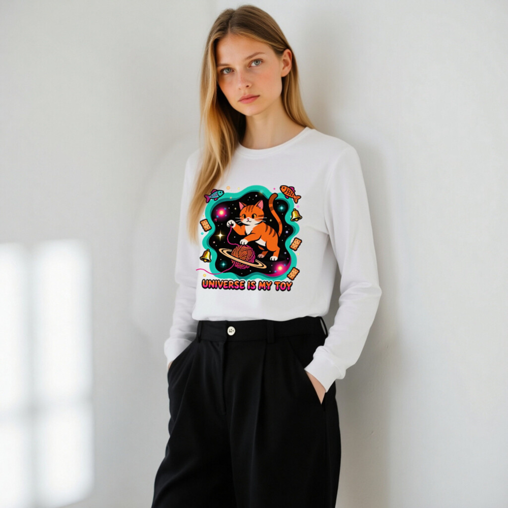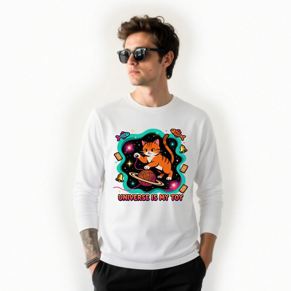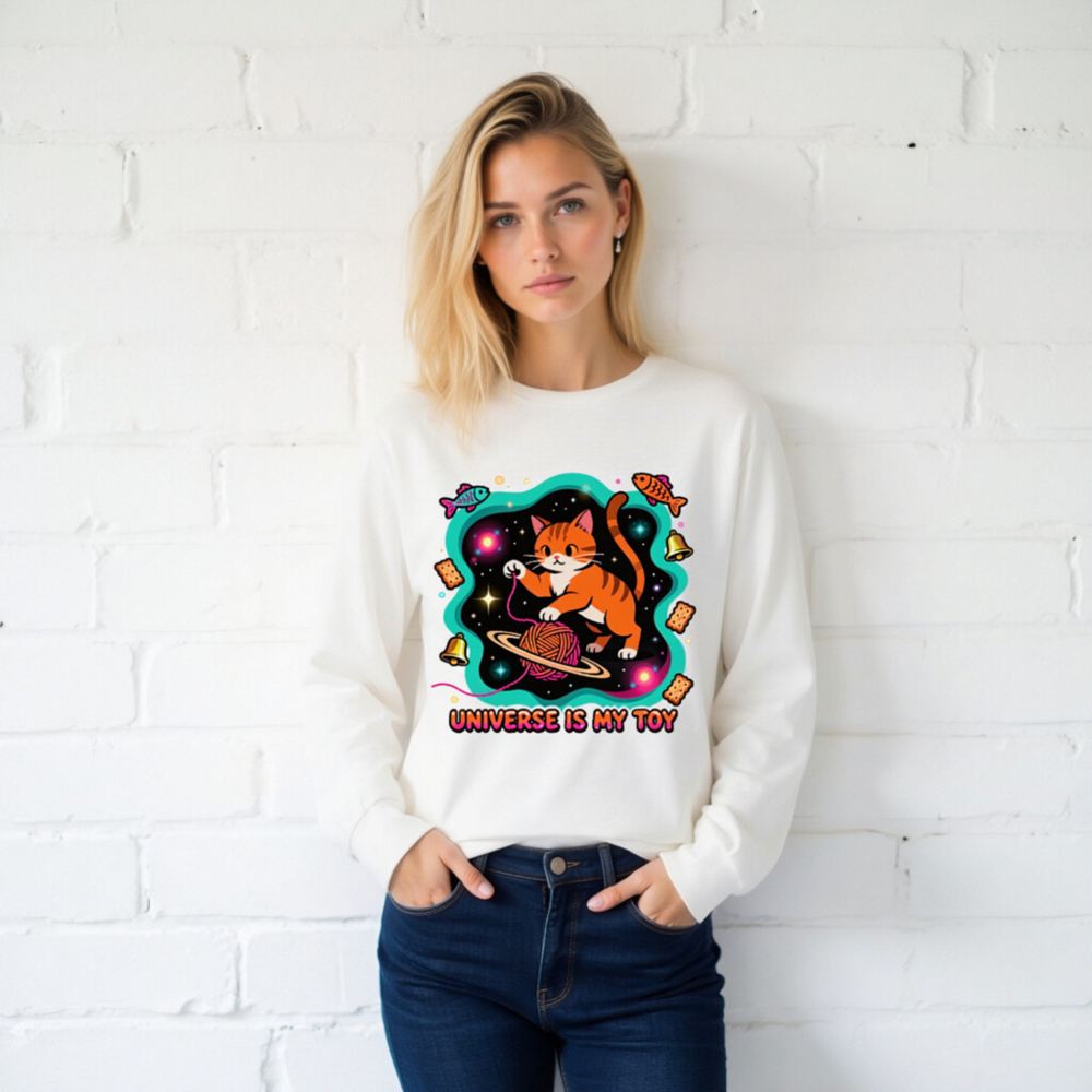This unisex long sleeve tee features a playful orange tabby cat in space, surrounded by yarn, planets, fish, bells, and treats—capturing the whimsical ‘Universe is My Toy’ theme. Soft cotton blend, comfortable fit for all genders. Ideal for cat lovers and cosmic dreamers. Designed for everyday wear with vibrant, eye-catching print.