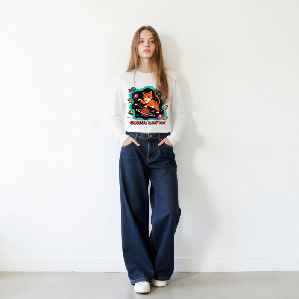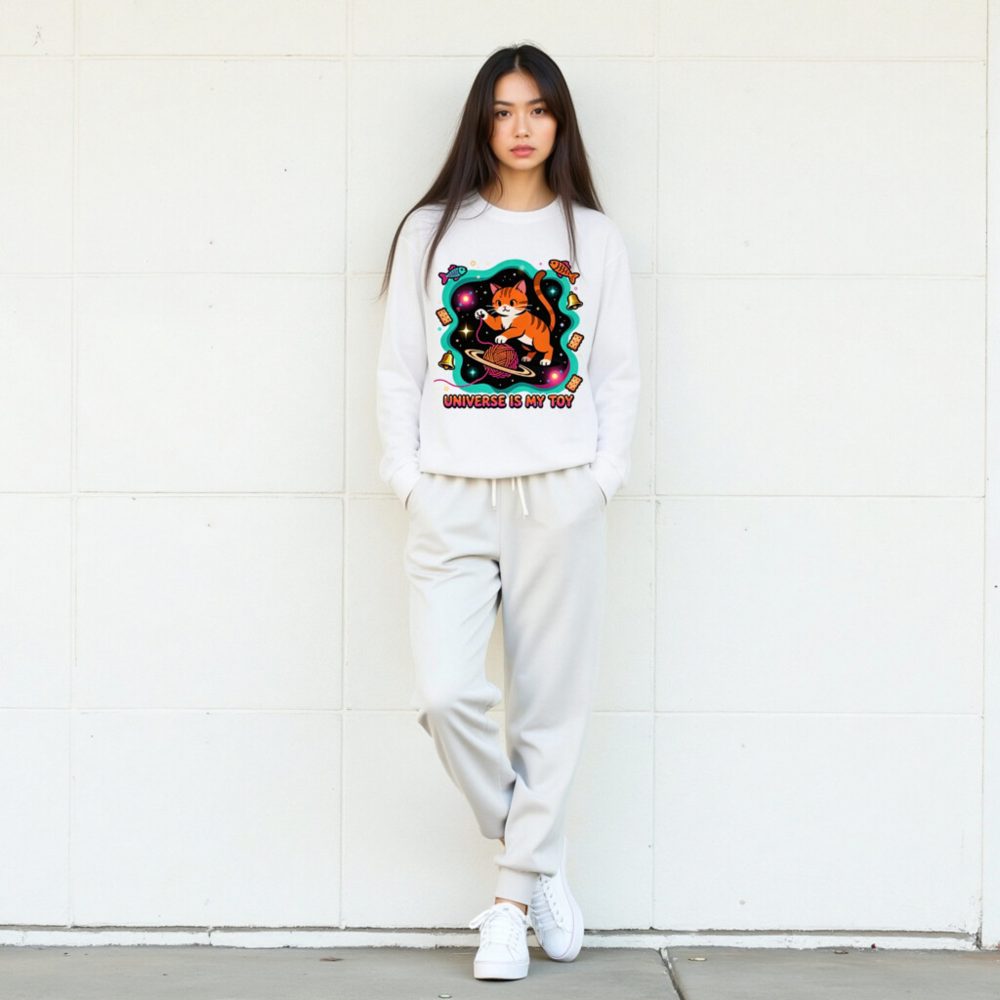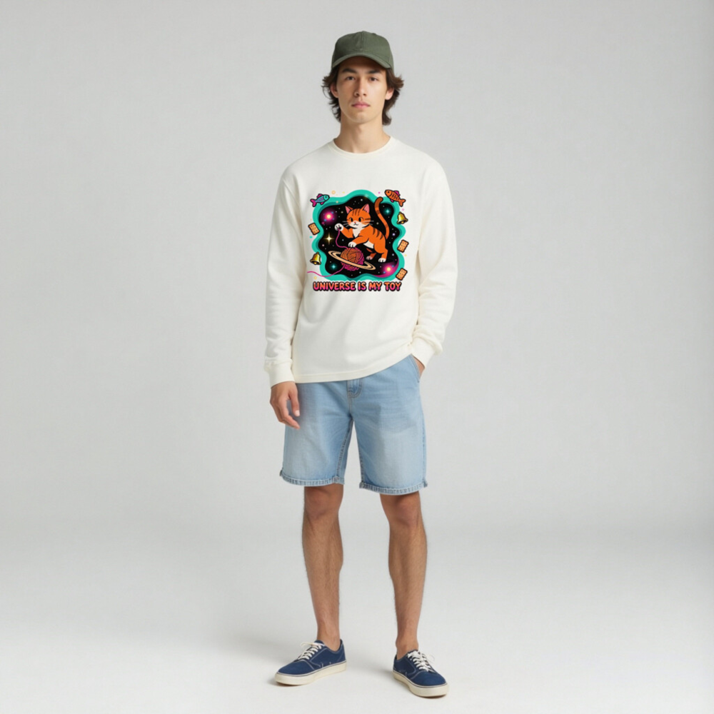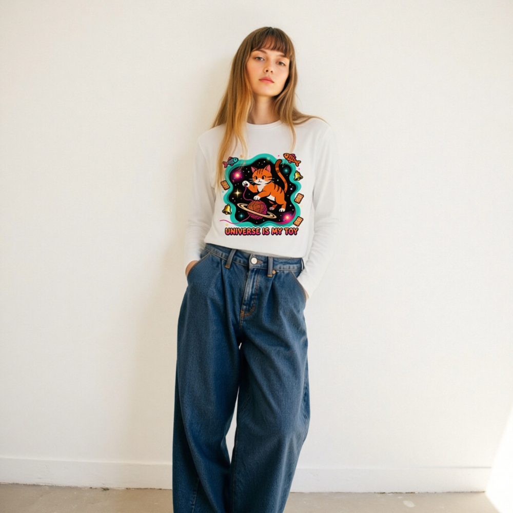 This unisex long sleeve tee features a playful orange tabby cat in space, surrounded by yarn, planets, fish, bells, and treats—capturing the whimsical ‘Universe is My Toy’ theme. Soft cotton blend, comfortable fit for all genders. Ideal for cat lovers and cosmic dreamers. Designed for everyday wear with vibrant, eye-catching print.