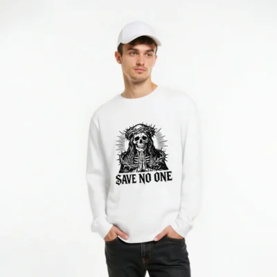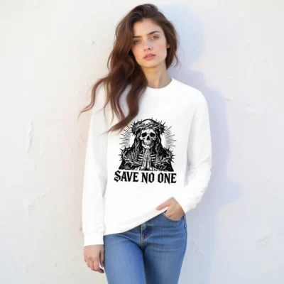 This unisex long sleeve tee features a striking black-and-white graphic: a skeletal figure wearing a crown of thorns, hands clasped in prayer, with radiant lines and the bold phrase ‘SAVE NO ONE’ below. Designed for gothic, alternative, or dark aesthetic lovers, the high-quality cotton blend offers comfort and durability. Ideal for everyday wear or as a statement piece. Fits true to size; machine washable.