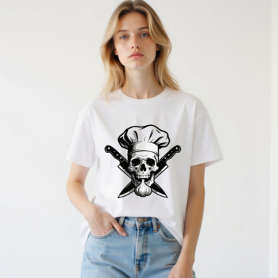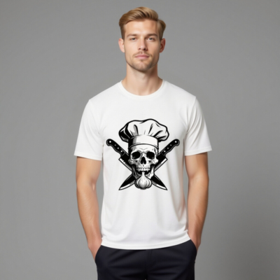 Unisex Organic Cotton Chef Skull T-Shirt – Crossed Knives & Garlic Design