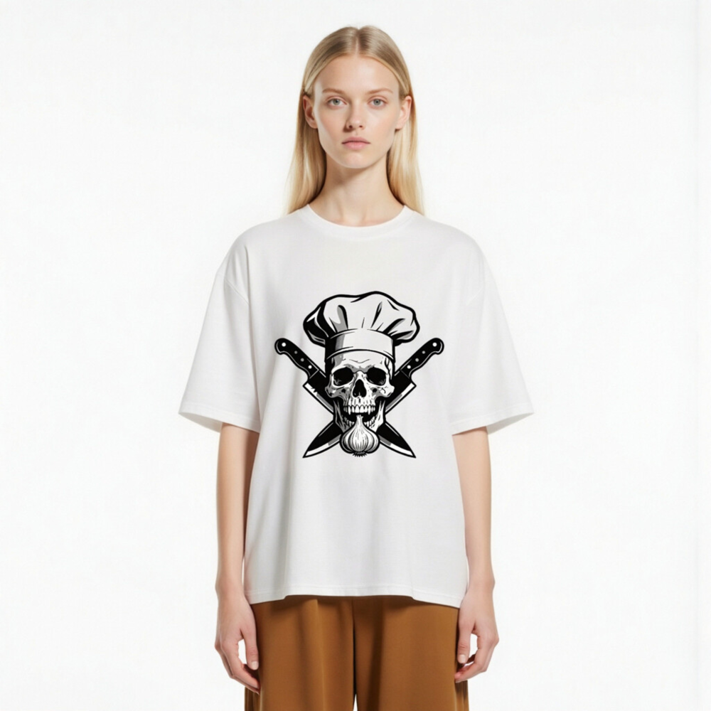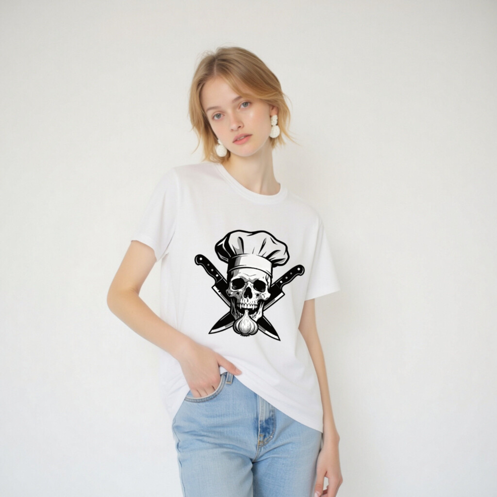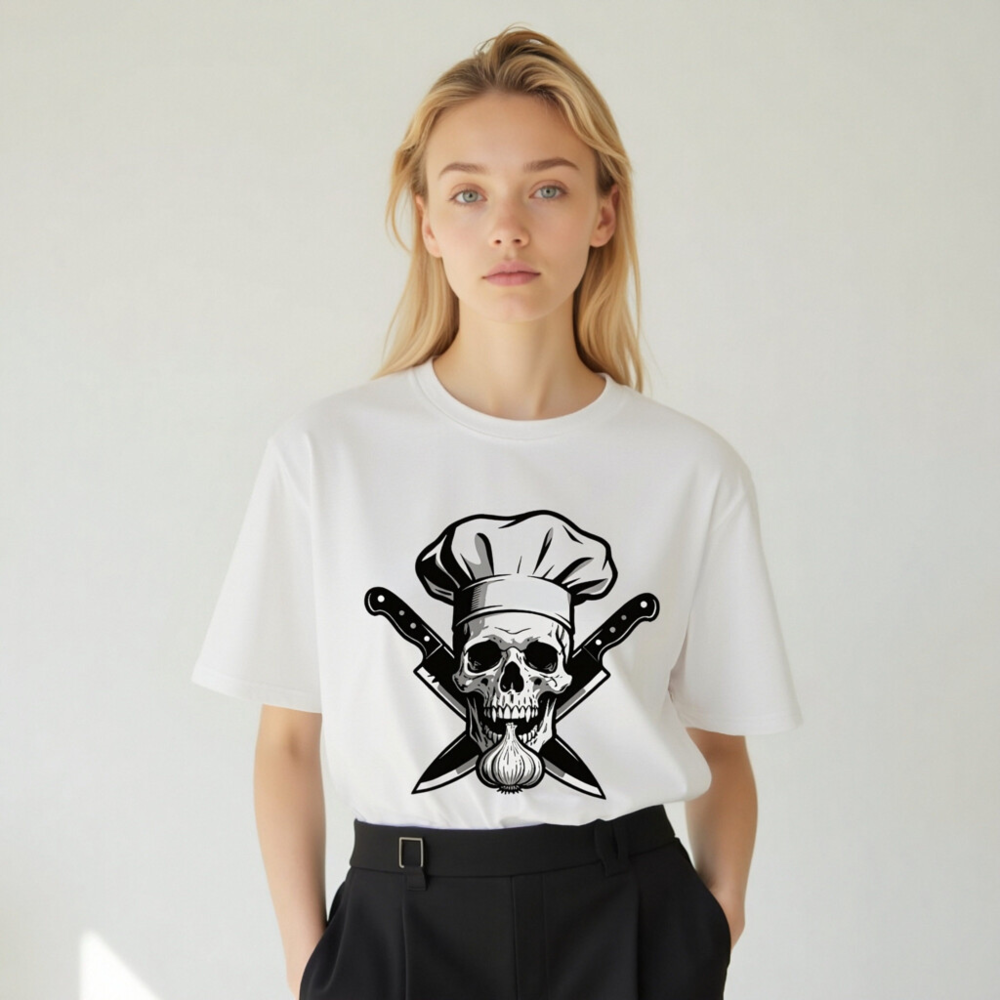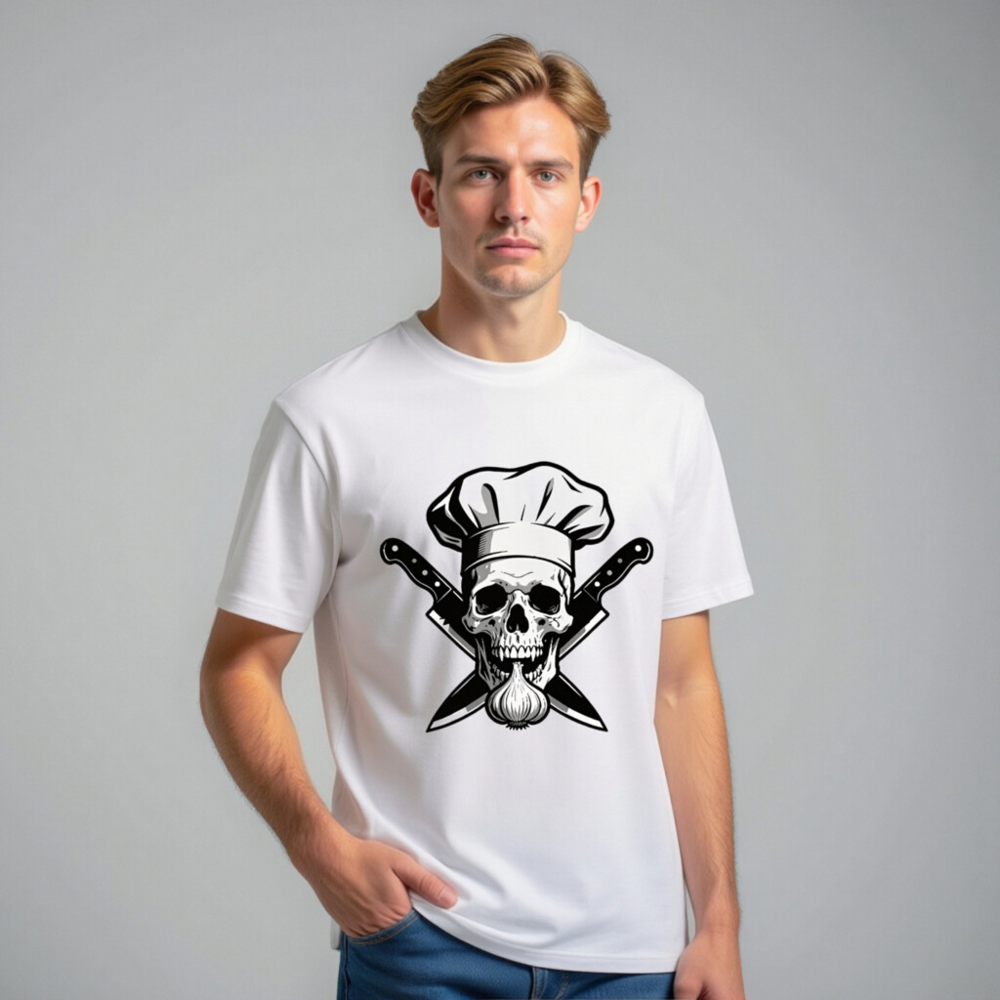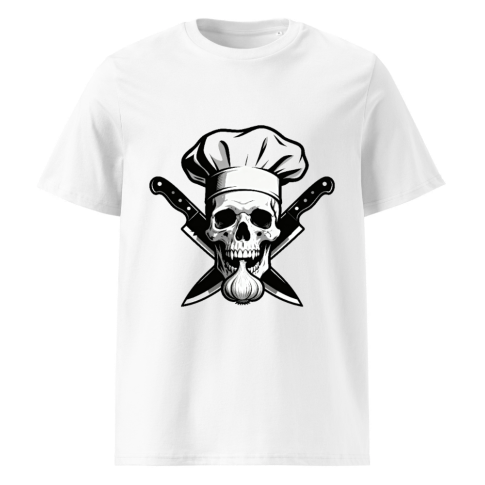 Unisex Organic Cotton Chef Skull T-Shirt – Crossed Knives & Garlic Design