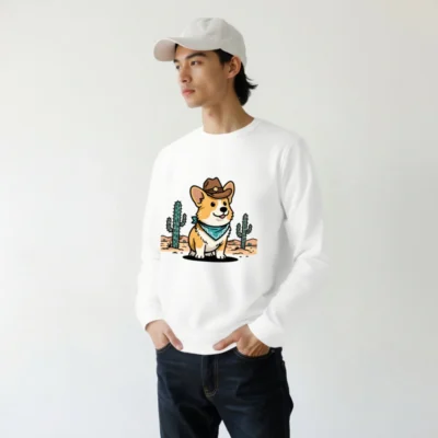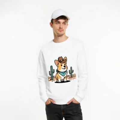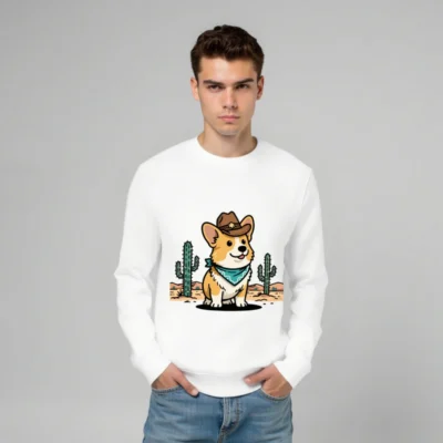 Show your wild side with this unisex organic cotton sweatshirt featuring a charming cowboy corgi in a desert scene—complete with cacti and star-adorned hat. Soft, eco-friendly fabric for comfort and sustainability. Perfect for casual wear or gifting. Designed for all sizes, machine-washable, and ethically made with certified organic cotton.