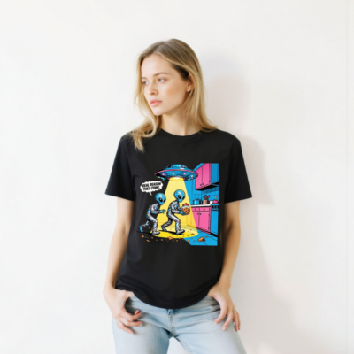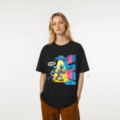 This unisex organic cotton t-shirt features a vibrant retro-futuristic alien scene: two blue aliens in metallic suits sneak into a kitchen under a UFO beam, one holding a cookie jar. The bold, colorful design includes the witty caption ‘REAL REASON THEY COME.’ Made from certified organic cotton for comfort and sustainability. Perfect for sci-fi fans and humor lovers.