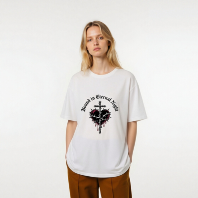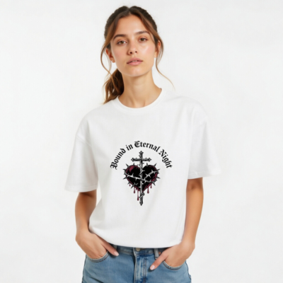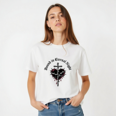 Wear the ‘Bound in Eternal Night’ design: a gothic-inspired unisex t-shirt featuring a cross piercing a thorn-wrapped heart with red drips, printed on certified organic cotton. Soft, breathable, and ethically made for everyday wear. Perfect for fans of dark aesthetics, metal, or occult-inspired fashion. Comfortable fit, sustainable material—no synthetic blends, no hidden certifications beyond what’s stated.