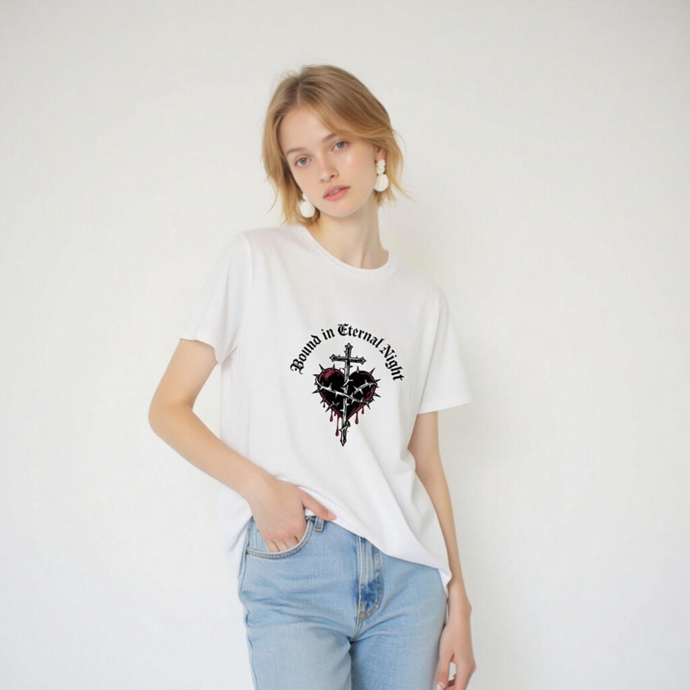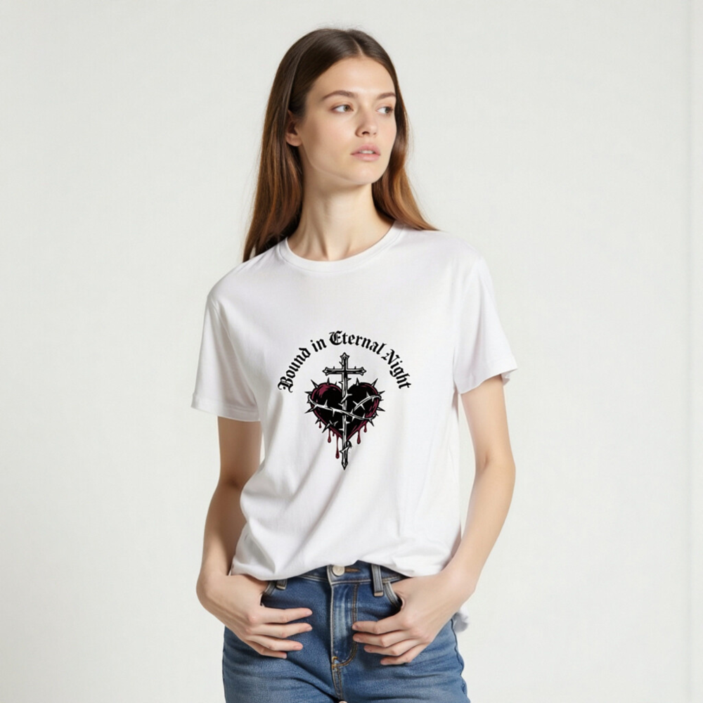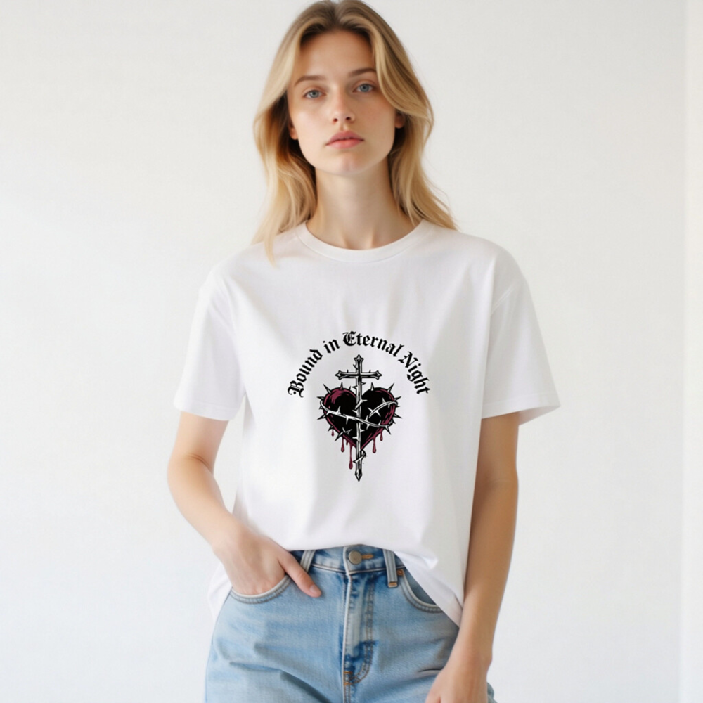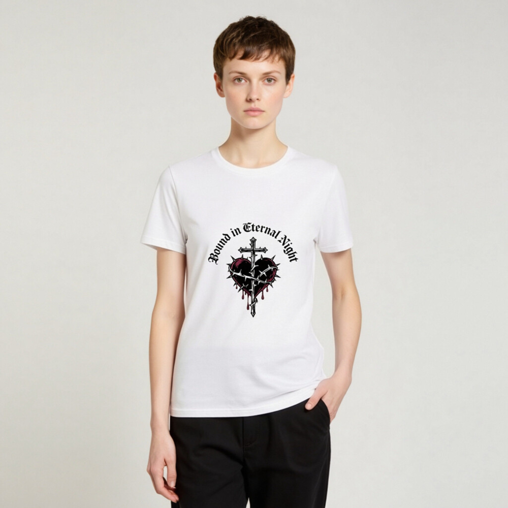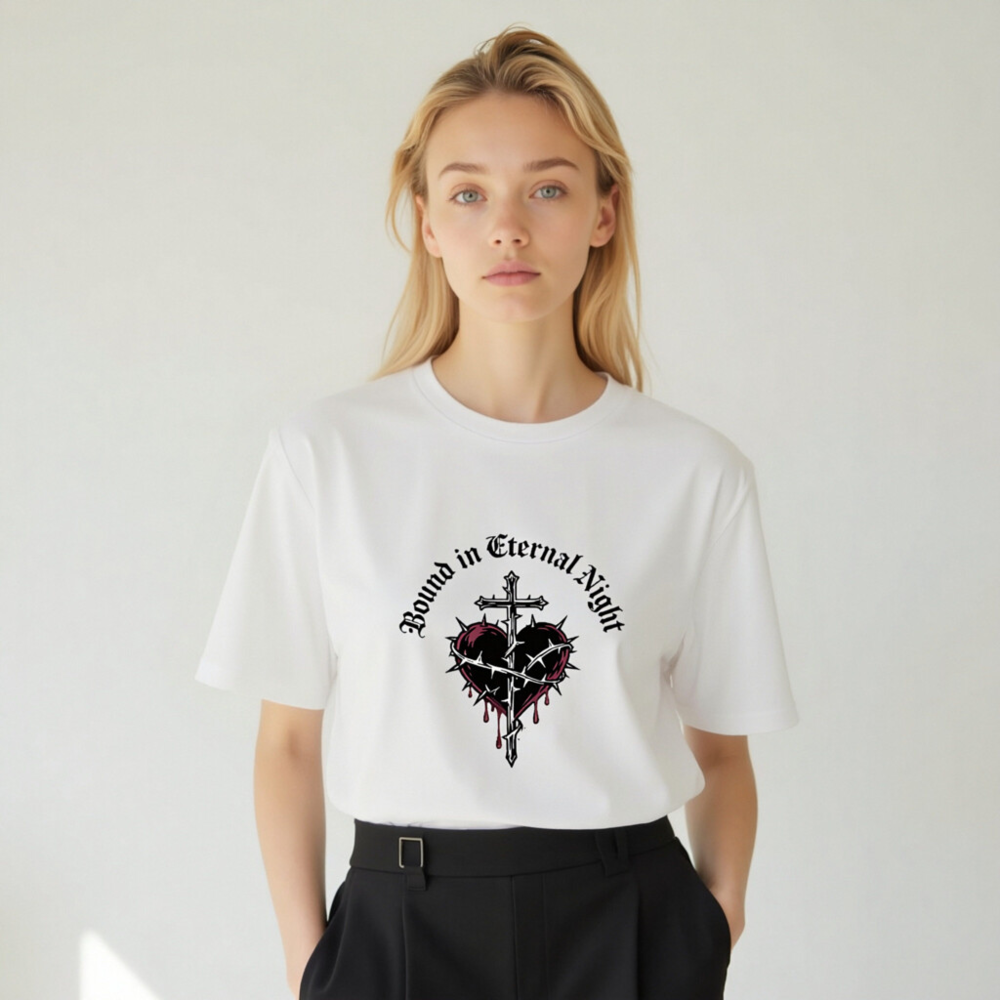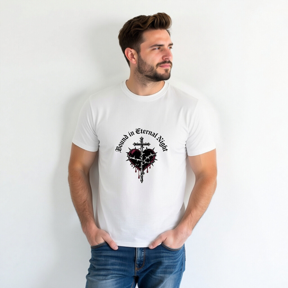 Wear the ‘Bound in Eternal Night’ design: a gothic-inspired unisex t-shirt featuring a cross piercing a thorn-wrapped heart with red drips, printed on certified organic cotton. Soft, breathable, and ethically made for everyday wear. Perfect for fans of dark aesthetics, metal, or occult-inspired fashion. Comfortable fit, sustainable material—no synthetic blends, no hidden certifications beyond what’s stated.