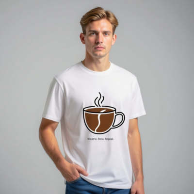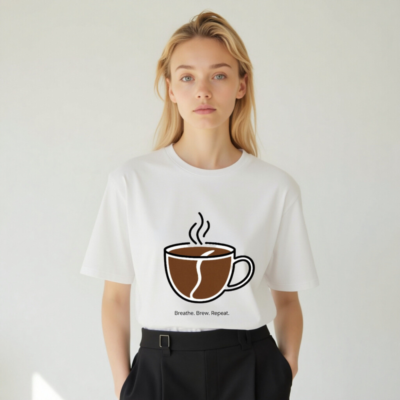 This unisex organic cotton t-shirt features a minimalist steaming coffee cup graphic with the motivational phrase ‘Breathe. Brew. Repeat.’—perfect for coffee lovers seeking comfort and style. Made from certified organic cotton, it offers softness, breathability, and sustainable quality. The clean, modern design pairs well with casual or work-from-home outfits. Ideal for daily wear, gifts, or self-care moments. No synthetic blends—just pure, eco-conscious comfort.