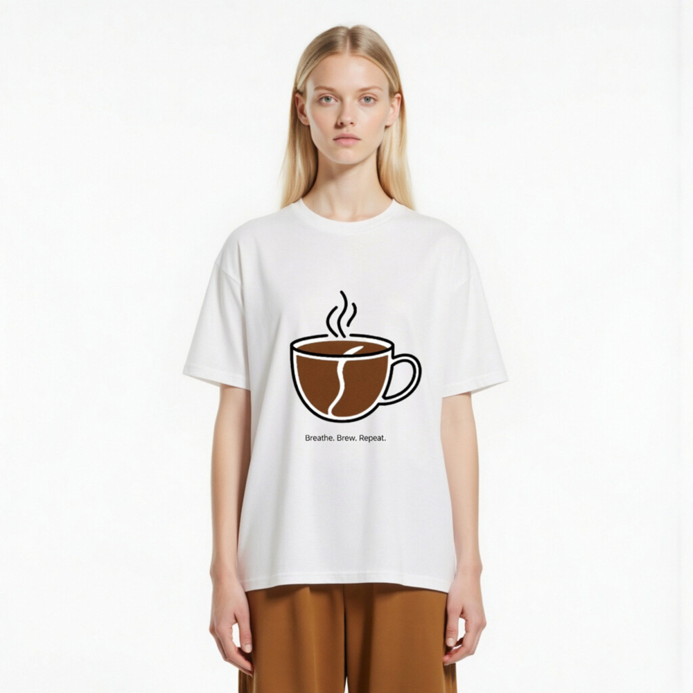 This unisex organic cotton t-shirt features a minimalist steaming coffee cup graphic with the motivational phrase ‘Breathe. Brew. Repeat.’—perfect for coffee lovers seeking comfort and style. Made from certified organic cotton, it offers softness, breathability, and sustainable quality. The clean, modern design pairs well with casual or work-from-home outfits. Ideal for daily wear, gifts, or self-care moments. No synthetic blends—just pure, eco-conscious comfort.