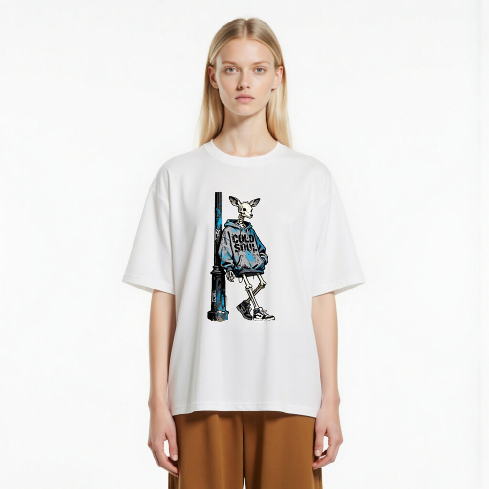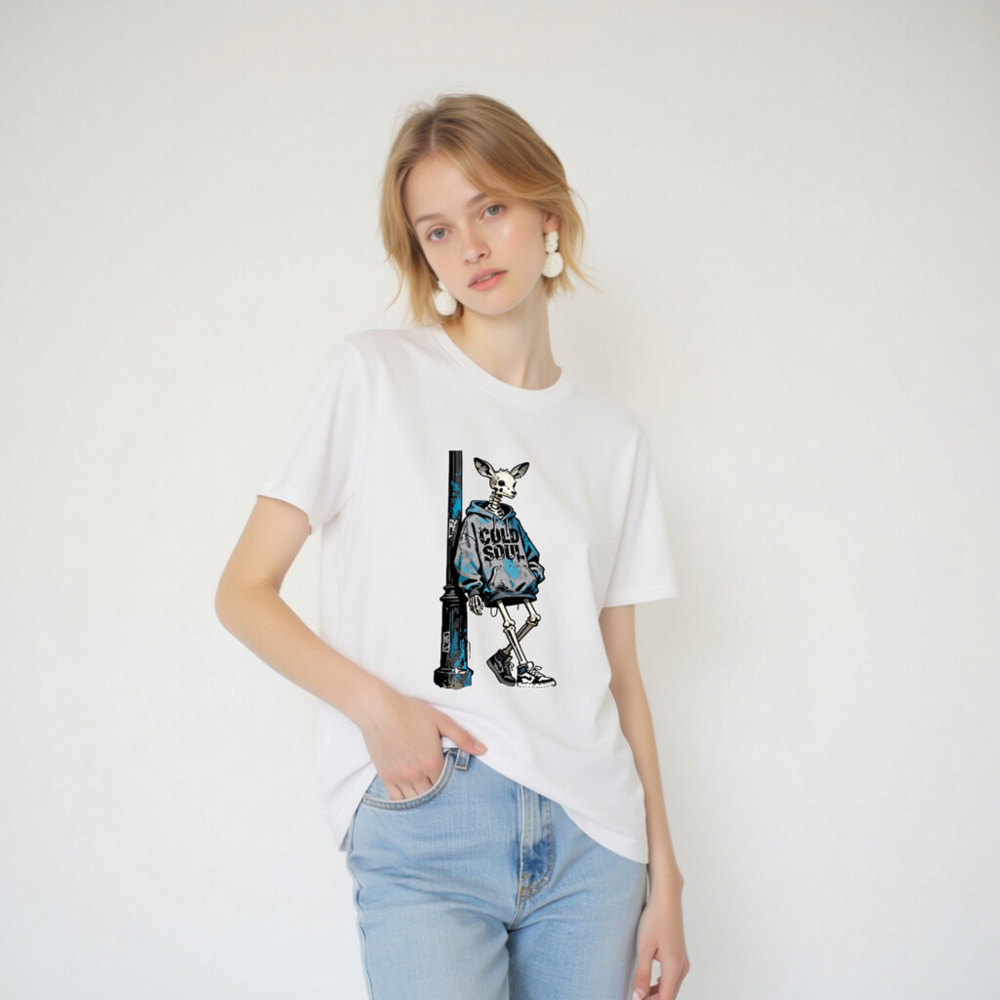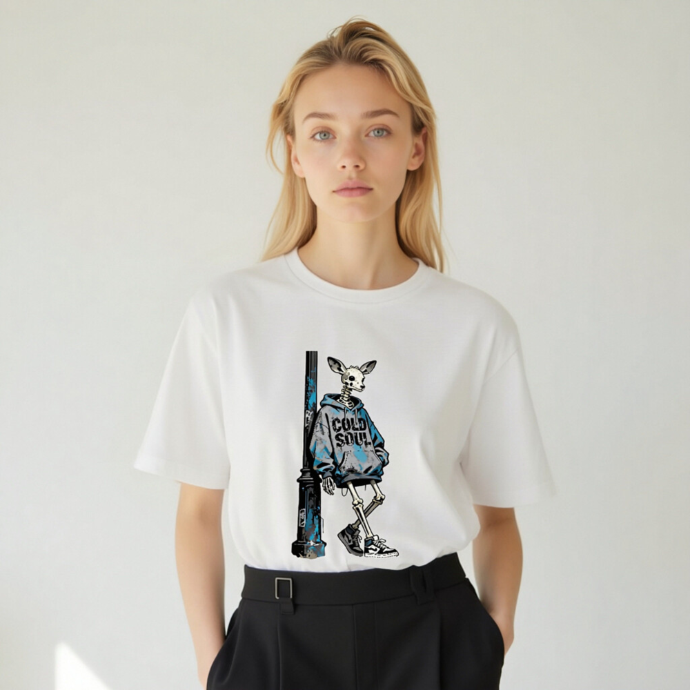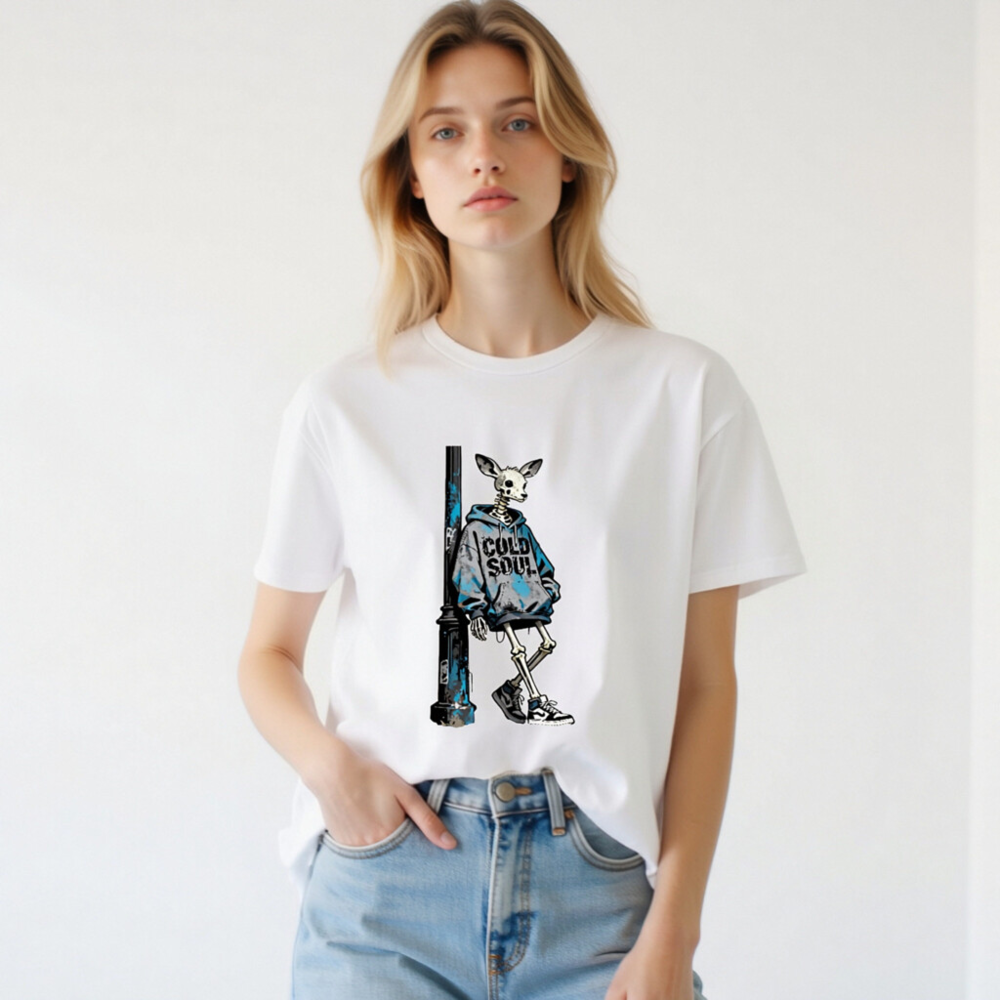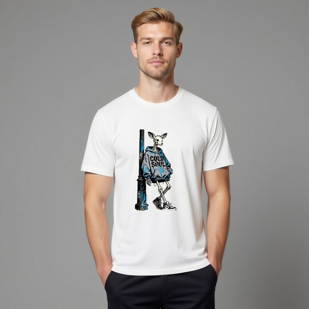 This unisex organic cotton t-shirt features a striking street art design: a skeletal deer in a blue ‘COLD SOUL’ hoodie leaning against a weathered pole. Made from certified organic cotton, it offers soft comfort and eco-conscious style. Ideal for urban fashion lovers seeking bold, artistic statements with sustainable values. Perfect for casual wear or as a conversation-starting gift.
