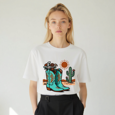 A unisex organic cotton t-shirt featuring a vibrant desert scene: turquoise cowboy boots with floral accents, a green saguaro cactus, and a warm sun. Crafted from certified organic cotton for comfort and sustainability. Perfect for casual wear, this design blends Western charm with eco-conscious style. Ideal gift for nature lovers and desert enthusiasts.