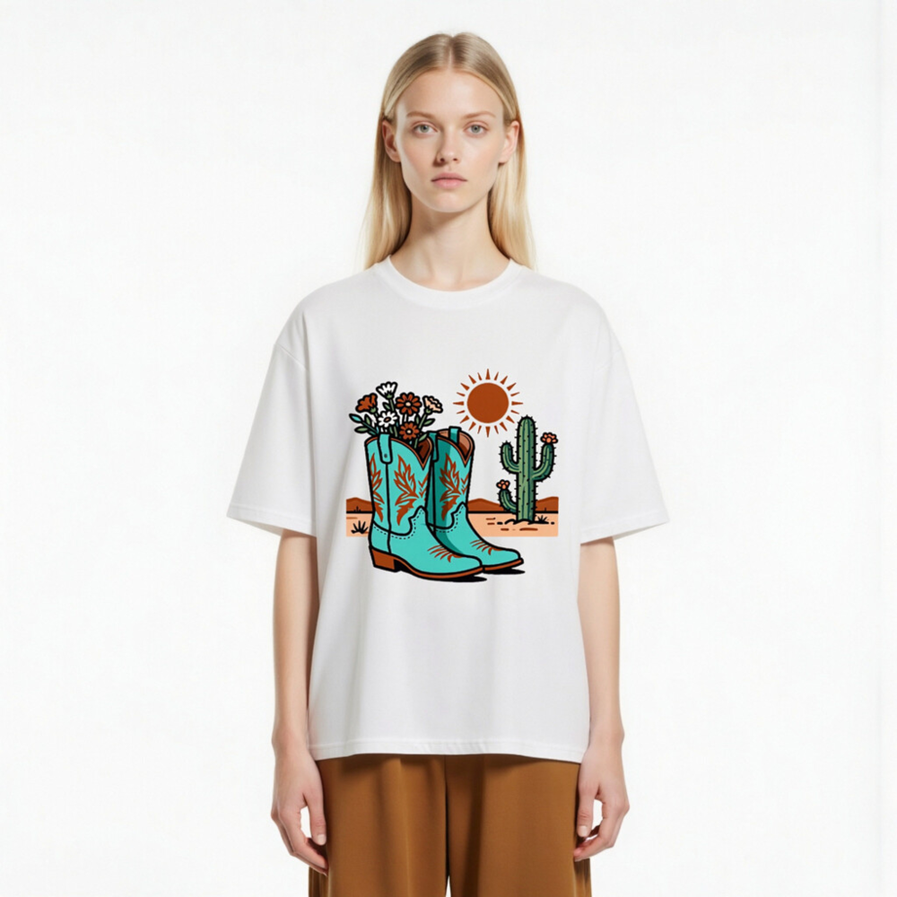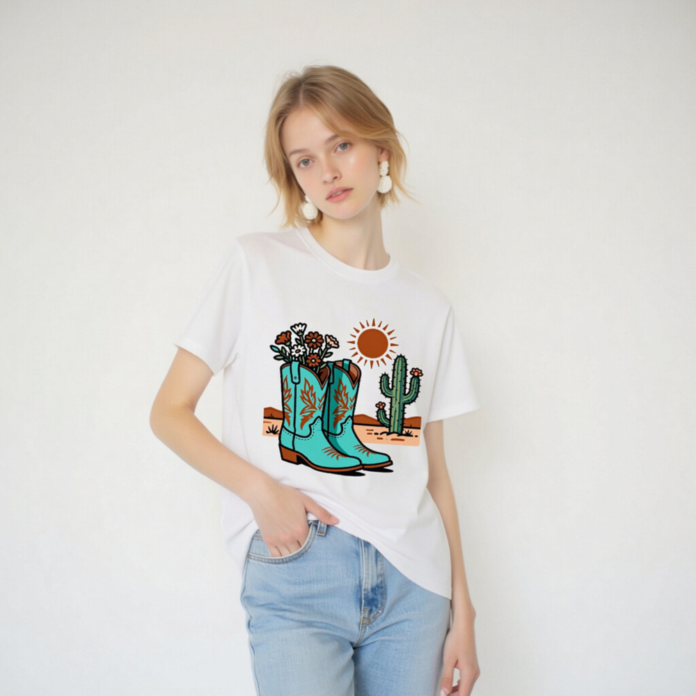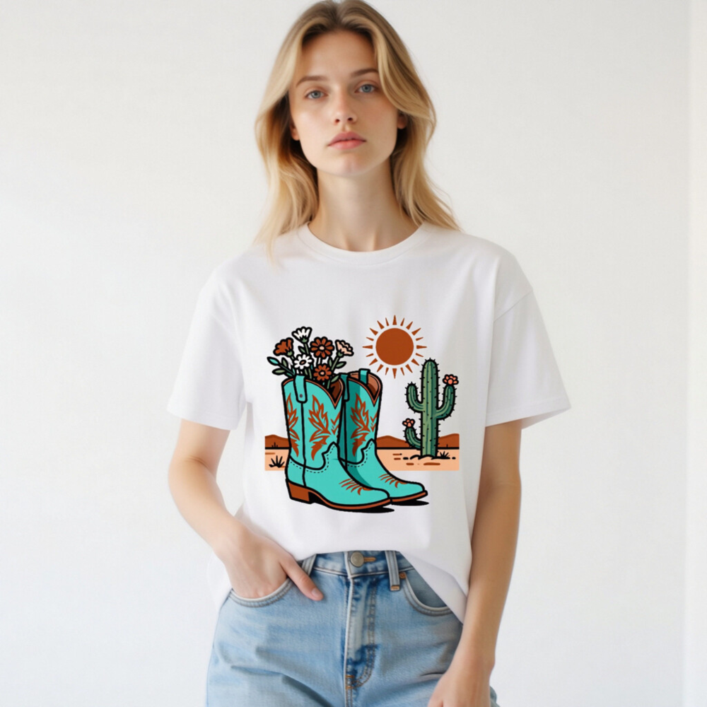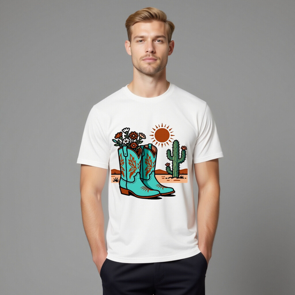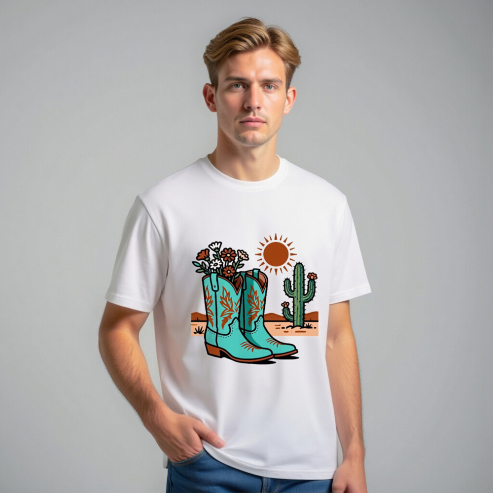 A unisex organic cotton t-shirt featuring a vibrant desert scene: turquoise cowboy boots with floral accents, a green saguaro cactus, and a warm sun. Crafted from certified organic cotton for comfort and sustainability. Perfect for casual wear, this design blends Western charm with eco-conscious style. Ideal gift for nature lovers and desert enthusiasts.