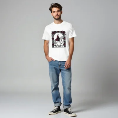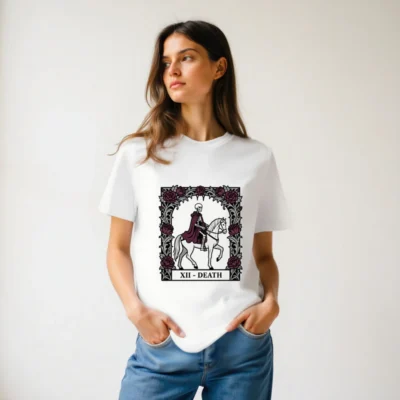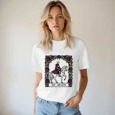 Wear the iconic Death Rider tarot card design on a comfortable, eco-conscious unisex organic cotton t-shirt. This premium tee features a detailed illustration of the skeletal rider in a burgundy cloak atop a white horse, framed by ornate roses and labeled ‘XII – DEATH’. Crafted from certified organic cotton for softness and sustainability. Ideal for tarot enthusiasts, gothic fashion lovers, and those seeking meaningful, high-quality apparel. Machine washable, ethically made, and designed to last.