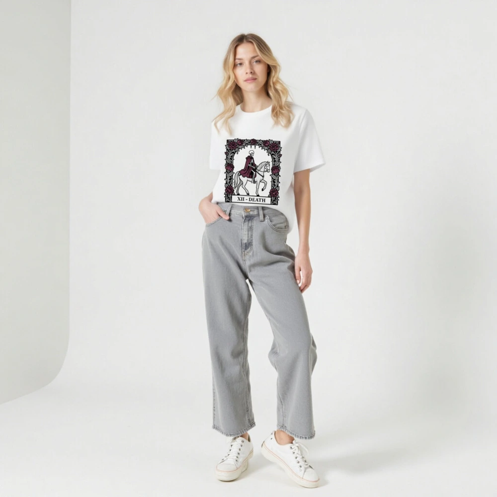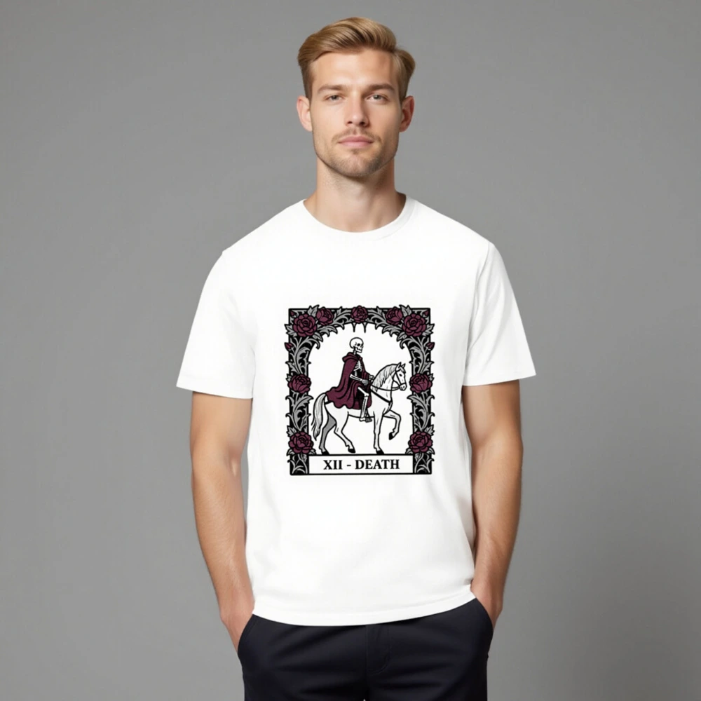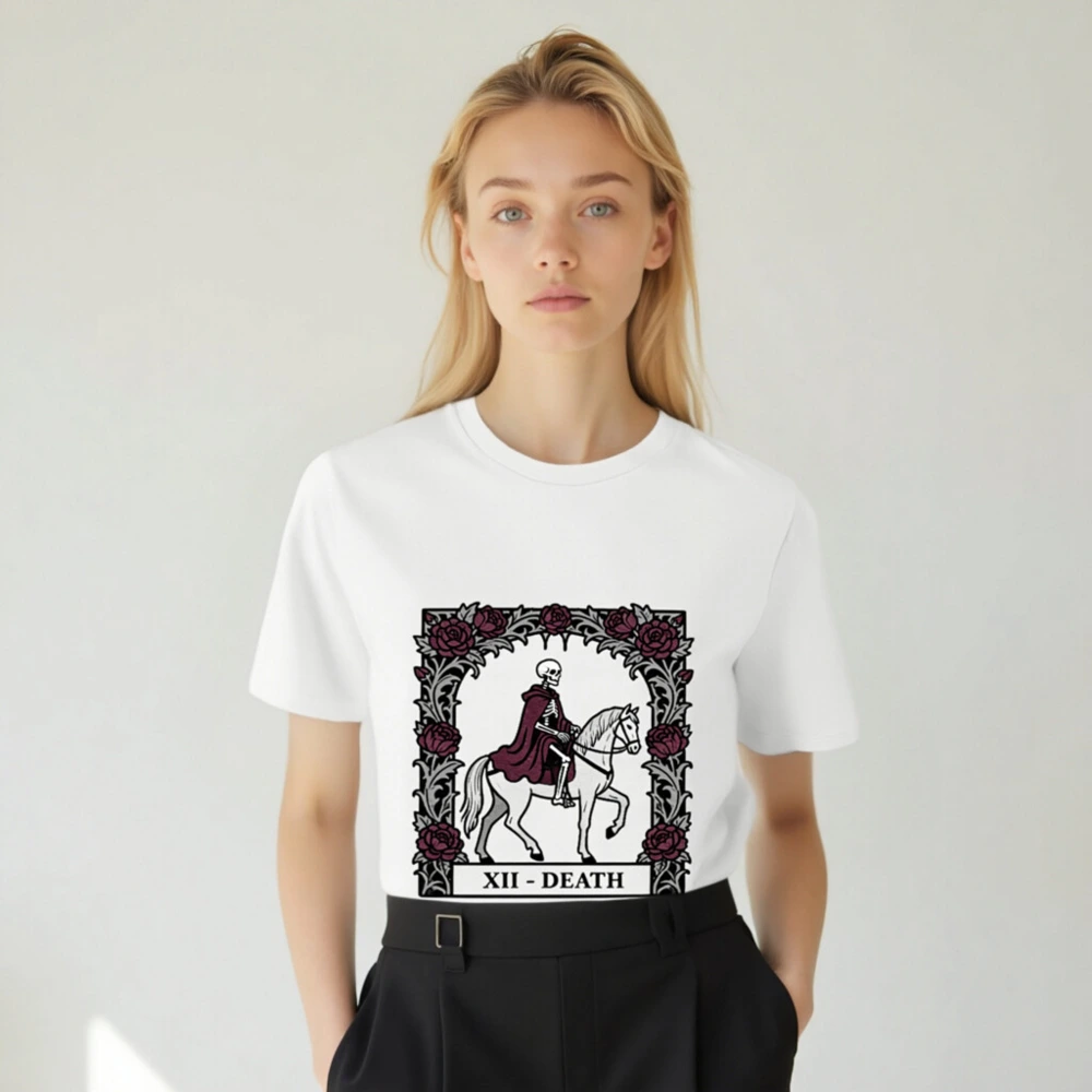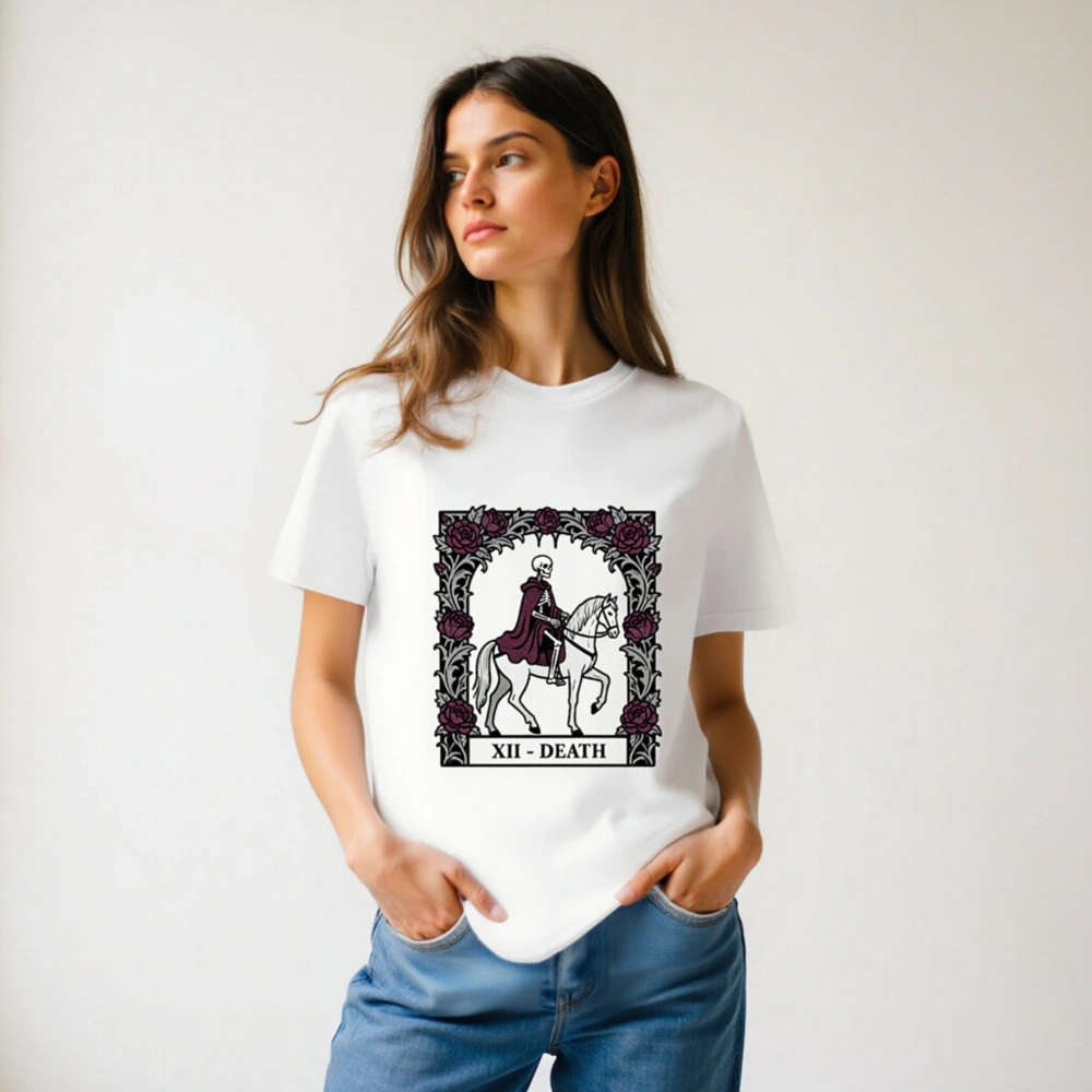 Wear the iconic Death Rider tarot card design on a comfortable, eco-conscious unisex organic cotton t-shirt. This premium tee features a detailed illustration of the skeletal rider in a burgundy cloak atop a white horse, framed by ornate roses and labeled ‘XII – DEATH’. Crafted from certified organic cotton for softness and sustainability. Ideal for tarot enthusiasts, gothic fashion lovers, and those seeking meaningful, high-quality apparel. Machine washable, ethically made, and designed to last.