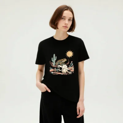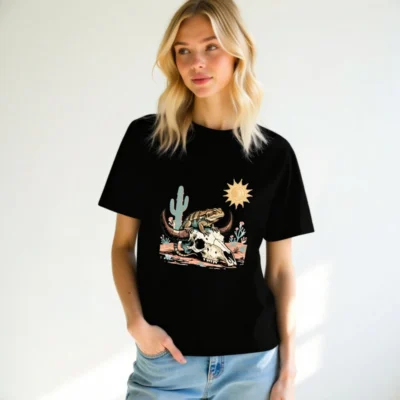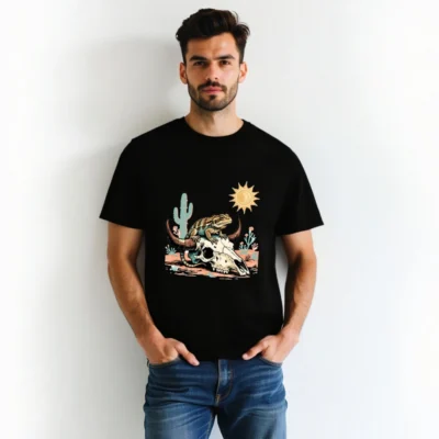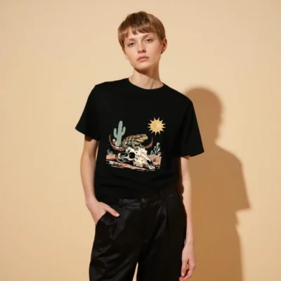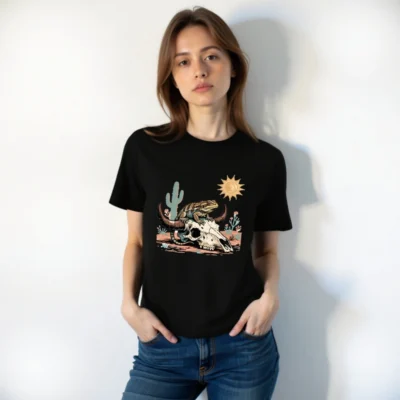 This unisex organic cotton t-shirt features a vibrant desert-themed graphic: a lizard perched atop a bull skull, surrounded by cacti, sun, and arid flora. Crafted from certified organic cotton for comfort and sustainability. Ideal for casual wear with bold, artistic appeal—perfect for nature lovers and desert enthusiasts. Machine washable, eco-friendly, and ethically made.