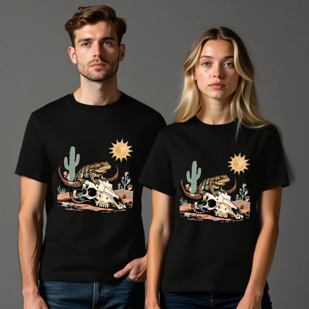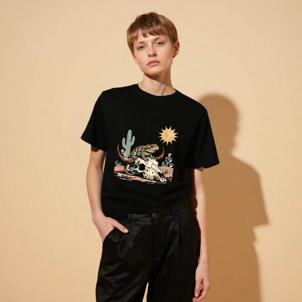 This unisex organic cotton t-shirt features a vibrant desert-themed graphic: a lizard perched atop a bull skull, surrounded by cacti, sun, and arid flora. Crafted from certified organic cotton for comfort and sustainability. Ideal for casual wear with bold, artistic appeal—perfect for nature lovers and desert enthusiasts. Machine washable, eco-friendly, and ethically made.