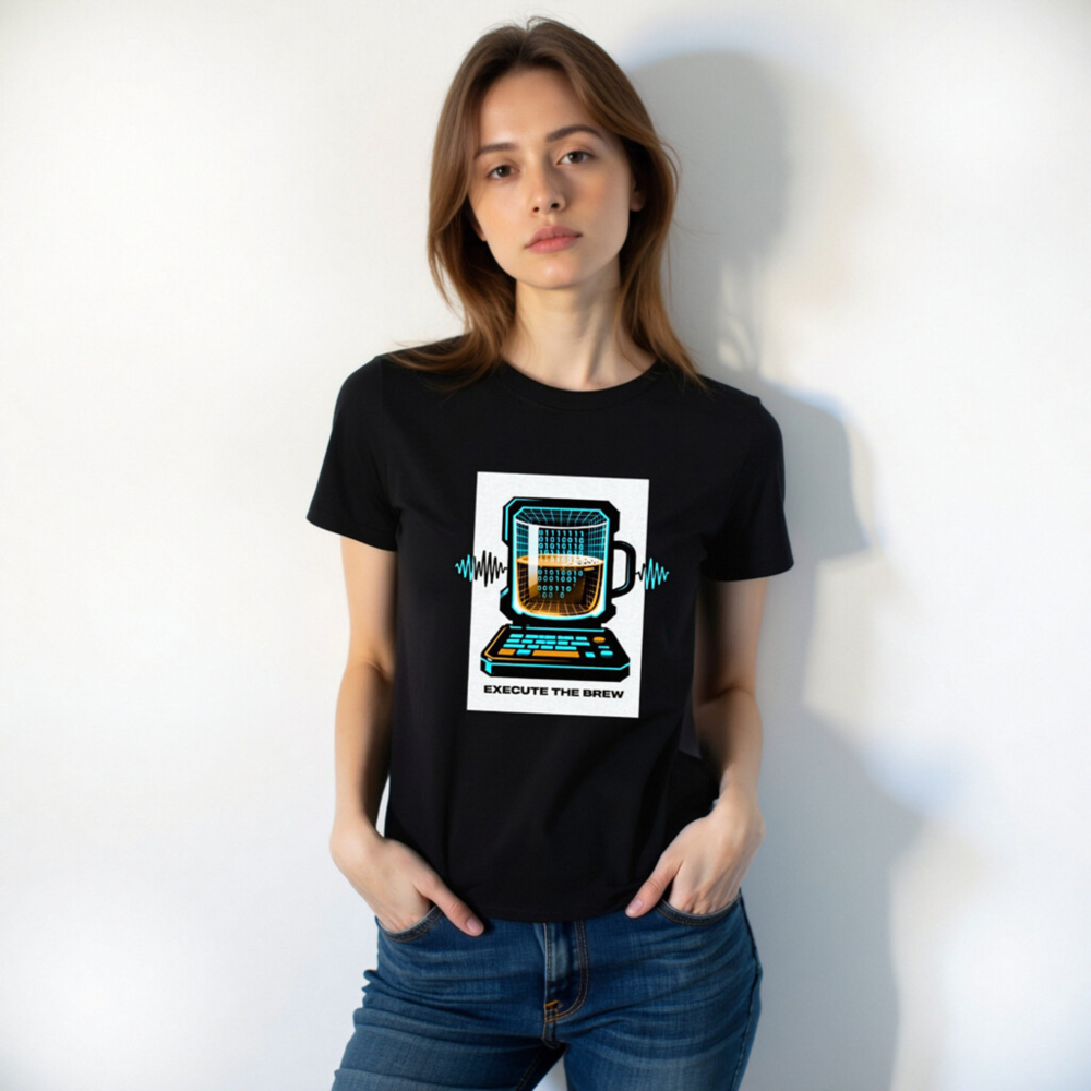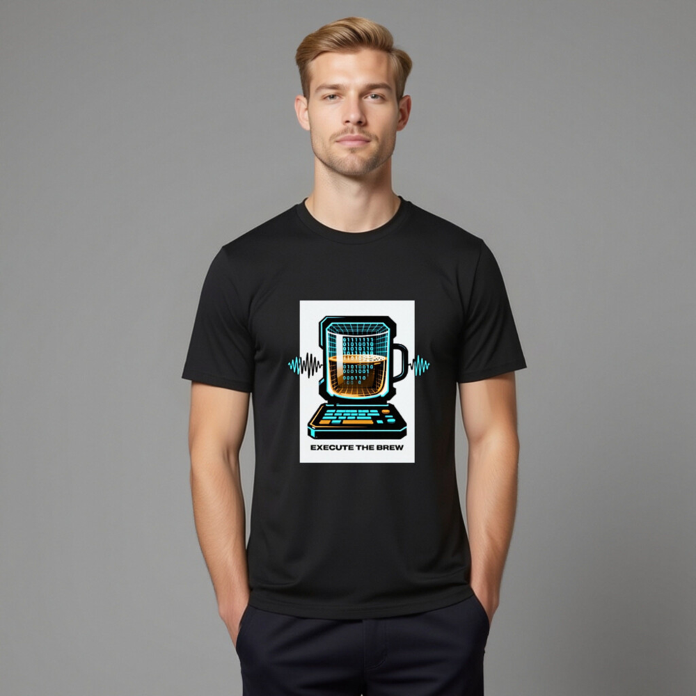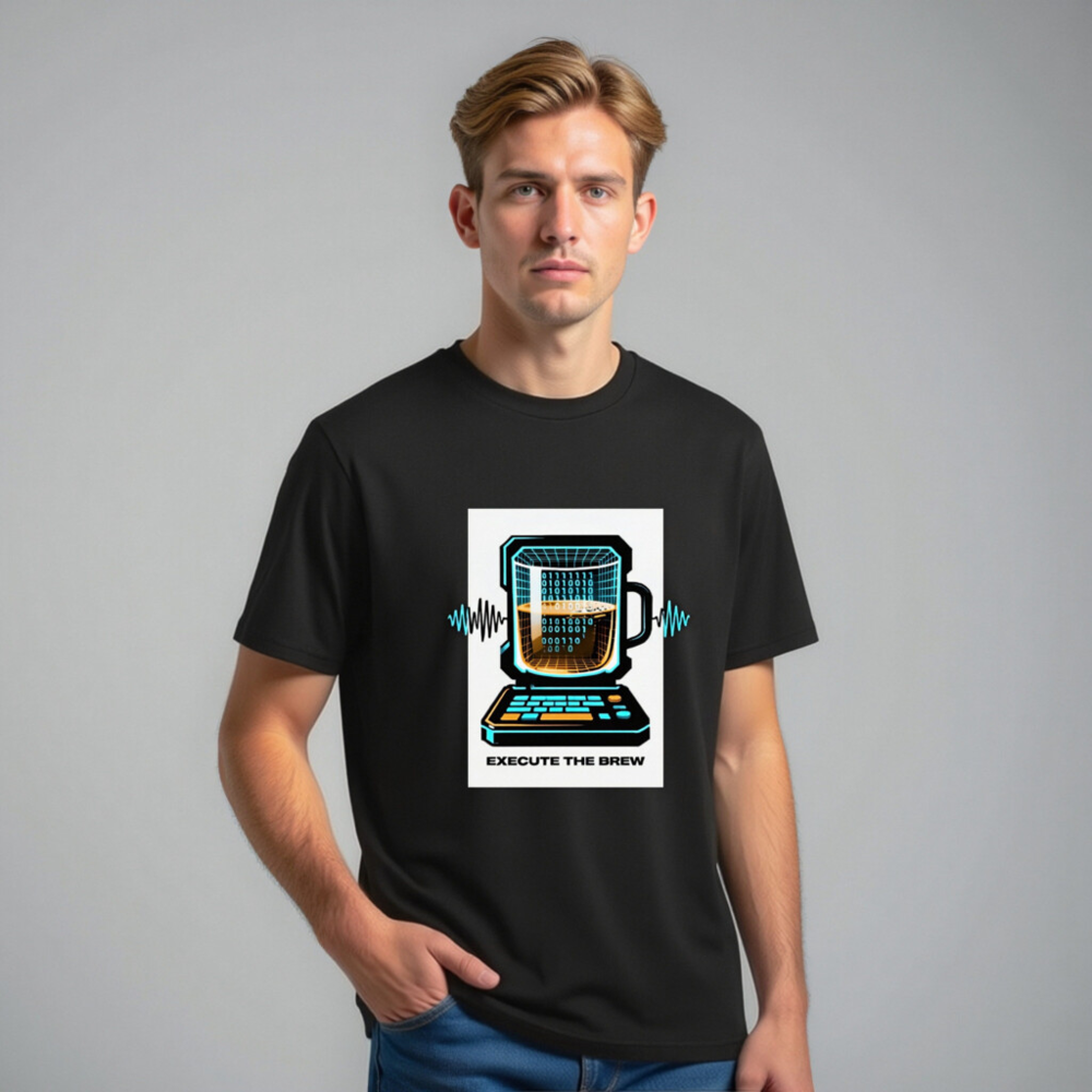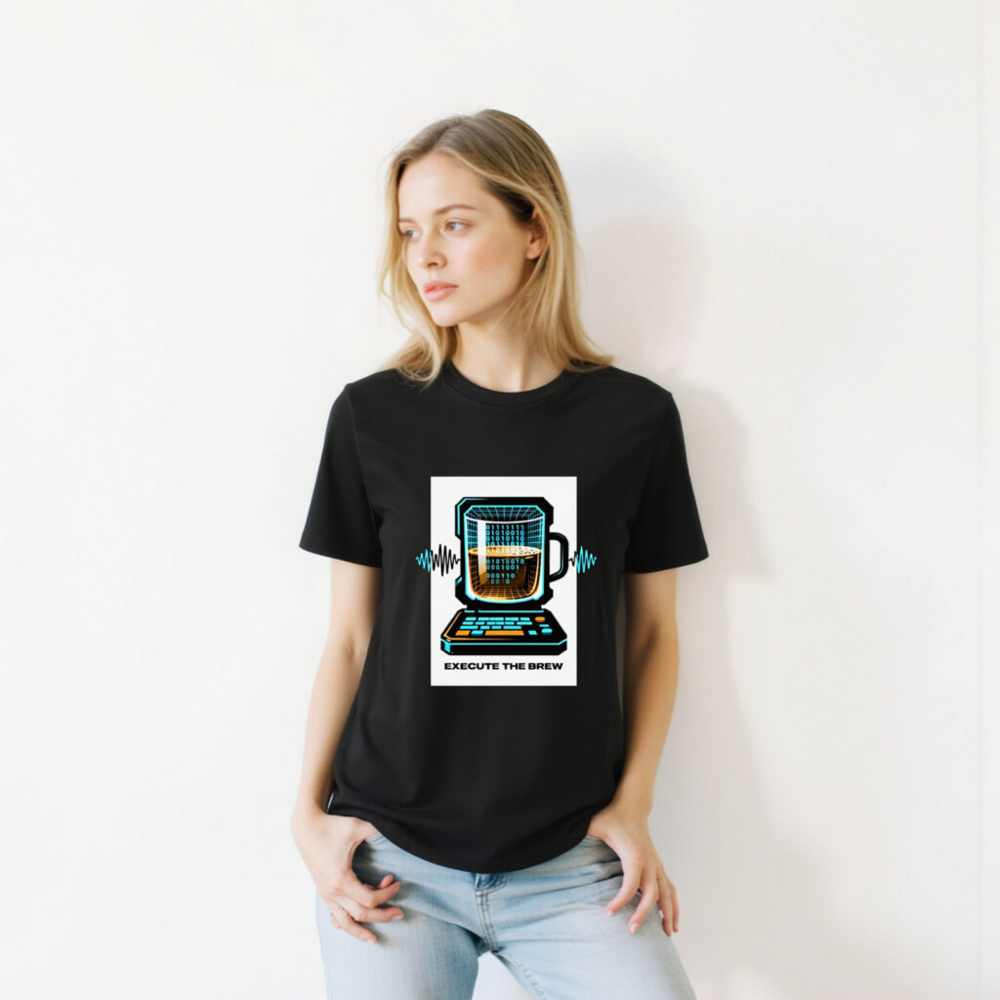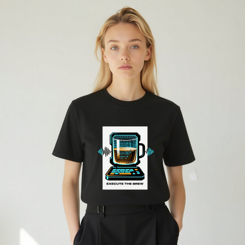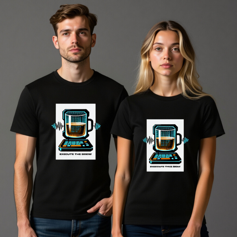 Show off your coding and coffee love with this unisex organic cotton t-shirt featuring a vibrant ‘Execute the Brew’ design: a retro-futuristic laptop with a mug as its screen, displaying binary code and a frothy brew. Crafted from certified organic cotton for comfort and sustainability. Perfect for developers, baristas, and tech enthusiasts who blend logic with warmth. Eco-friendly, stylish, and ready to run.