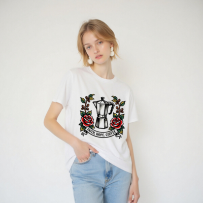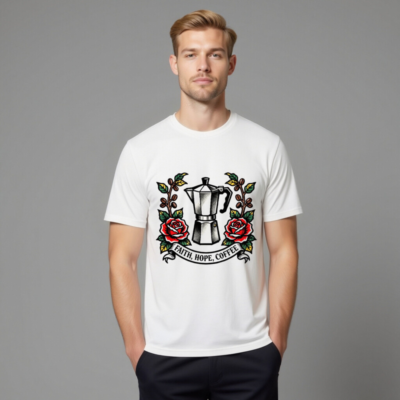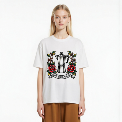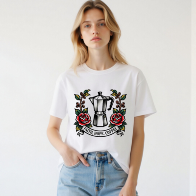 Wear your values with this unisex organic cotton t-shirt featuring a bold vintage tattoo-style design: a classic moka pot flanked by red roses and coffee beans, crowned with the uplifting phrase ‘FAITH, HOPE, COFFEE’. Soft, sustainable, and stylish—perfect for coffee lovers who appreciate meaningful art. Made from certified organic cotton (no additional certifications or claims provided beyond ‘organic cotton’).