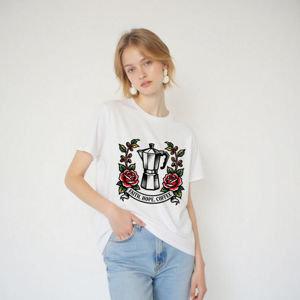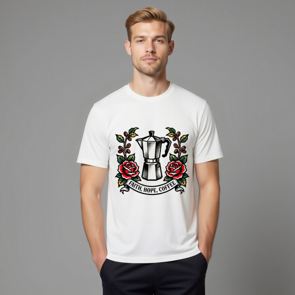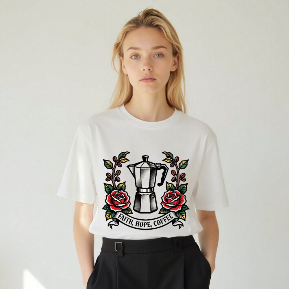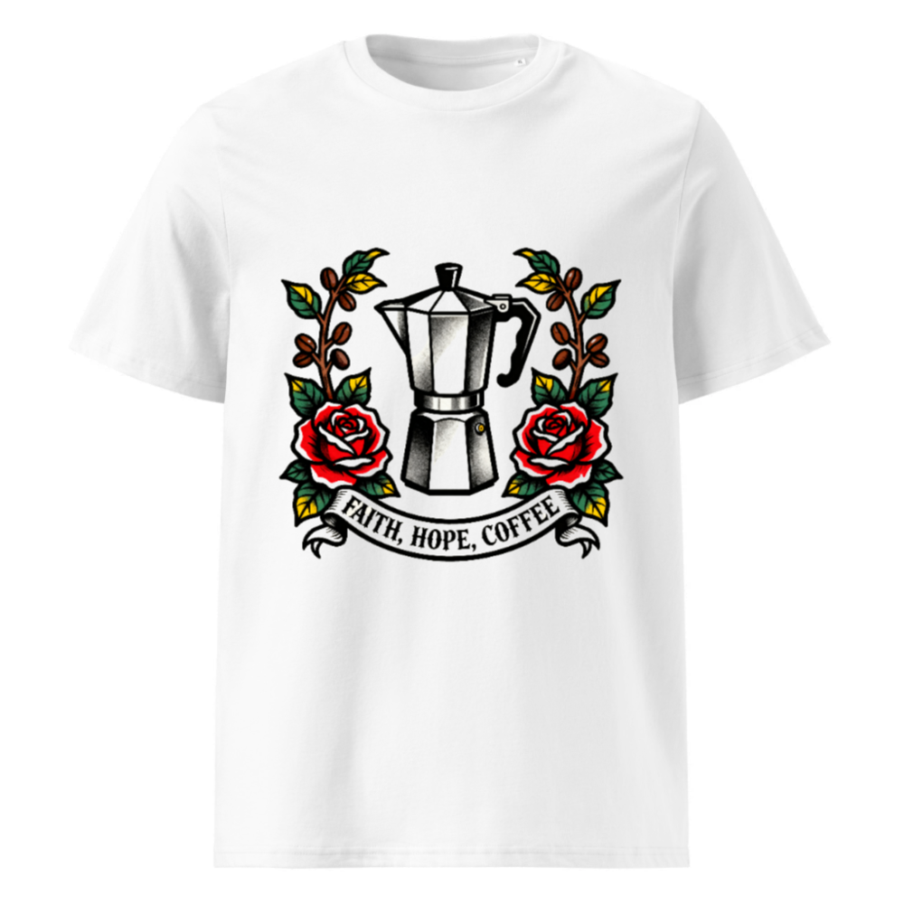 Unisex Organic Cotton T-Shirt | Faith, Hope, Coffee Moka Pot Rose Tattoo Design