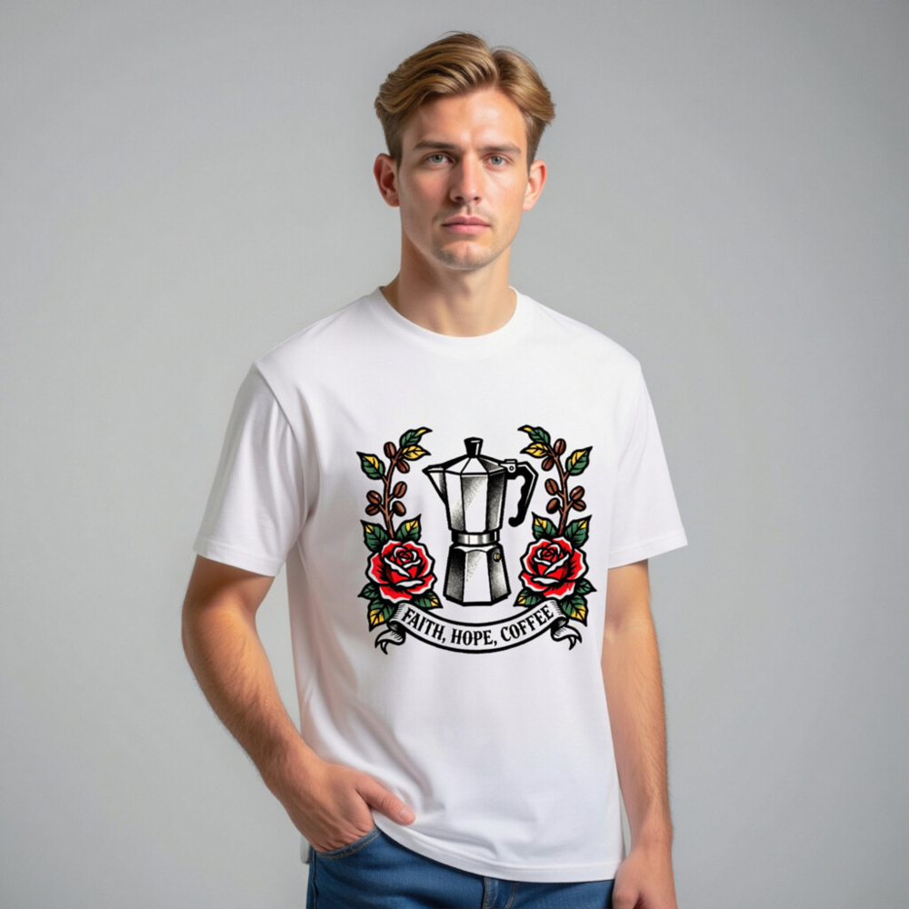 Wear your values with this unisex organic cotton t-shirt featuring a bold vintage tattoo-style design: a classic moka pot flanked by red roses and coffee beans, crowned with the uplifting phrase ‘FAITH, HOPE, COFFEE’. Soft, sustainable, and stylish—perfect for coffee lovers who appreciate meaningful art. Made from certified organic cotton (no additional certifications or claims provided beyond ‘organic cotton’).