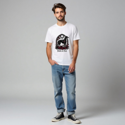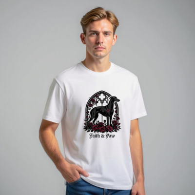 Handcrafted unisex organic cotton t-shirt featuring a striking Gothic-style black greyhound silhouette framed by deep red roses and cathedral arches. ‘Faith & Paw’ text adds heartfelt charm. Soft, breathable, and ethically made for comfort and style. Ideal for dog lovers and gothic aesthetics. Eco-conscious choice—no certifications claimed beyond material specification.