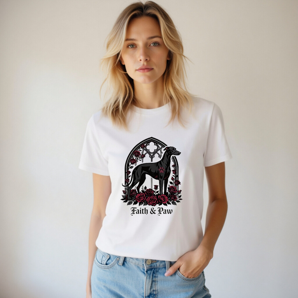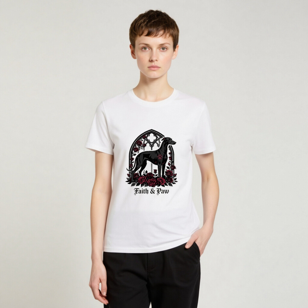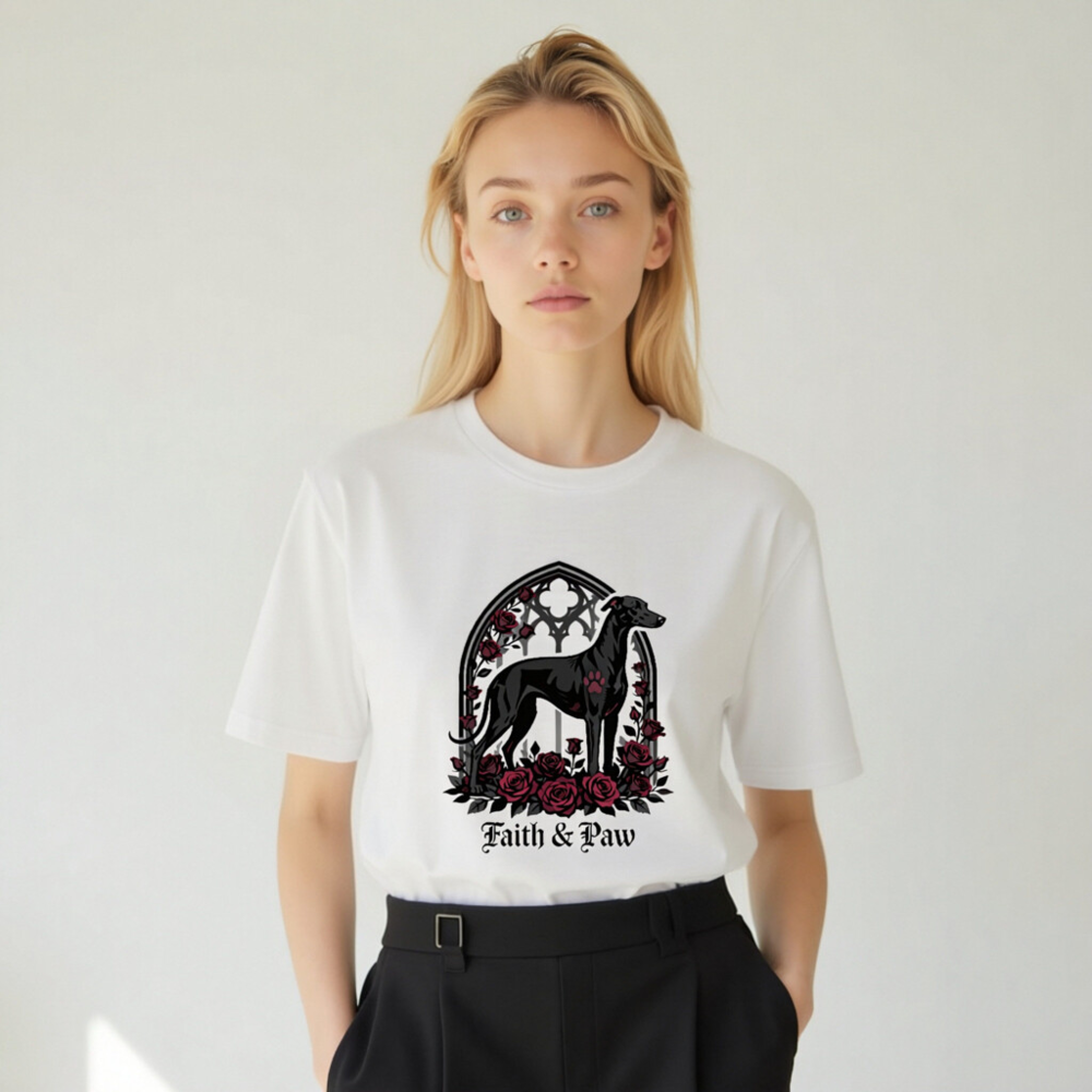 Handcrafted unisex organic cotton t-shirt featuring a striking Gothic-style black greyhound silhouette framed by deep red roses and cathedral arches. ‘Faith & Paw’ text adds heartfelt charm. Soft, breathable, and ethically made for comfort and style. Ideal for dog lovers and gothic aesthetics. Eco-conscious choice—no certifications claimed beyond material specification.