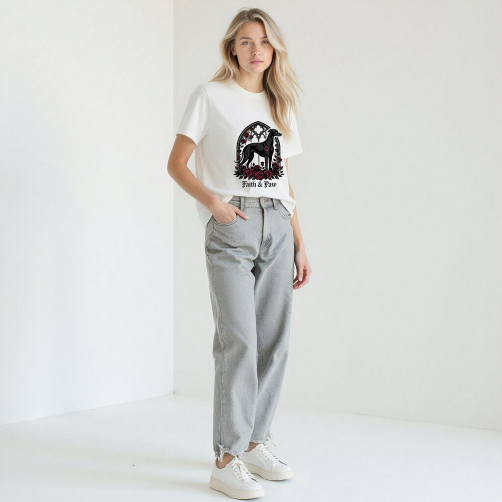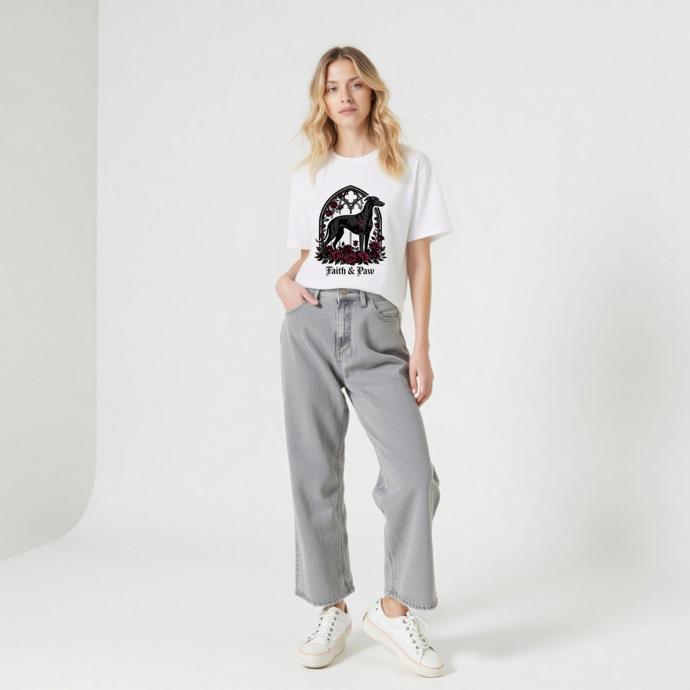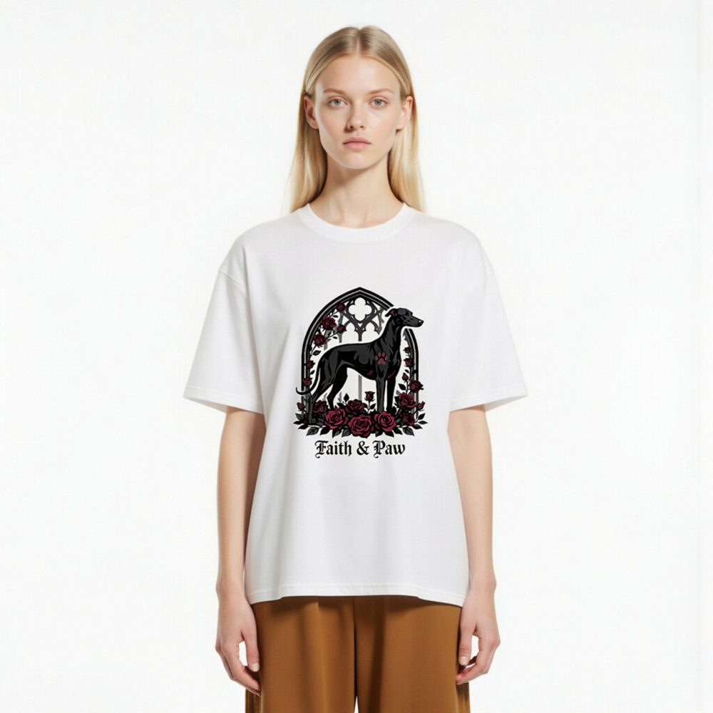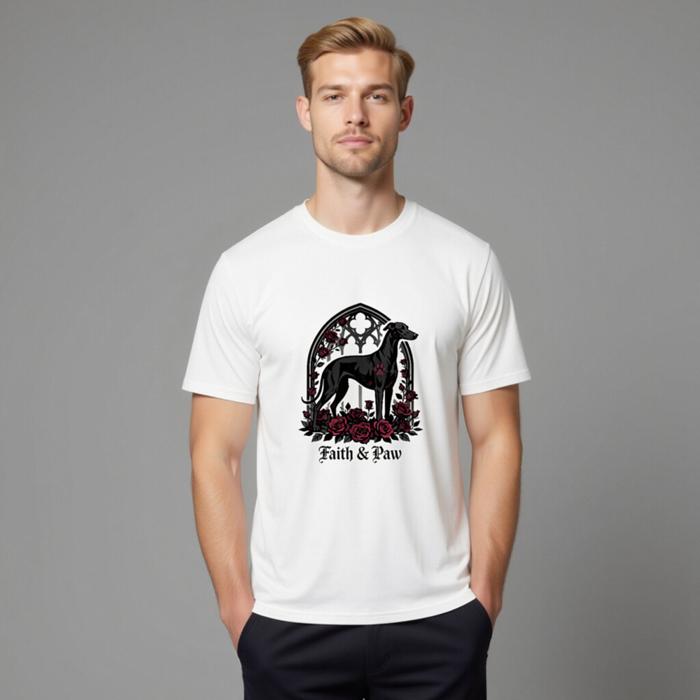 Handcrafted unisex organic cotton t-shirt featuring a striking Gothic-style black greyhound silhouette framed by deep red roses and cathedral arches. ‘Faith & Paw’ text adds heartfelt charm. Soft, breathable, and ethically made for comfort and style. Ideal for dog lovers and gothic aesthetics. Eco-conscious choice—no certifications claimed beyond material specification.