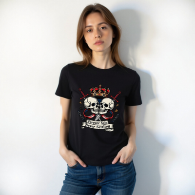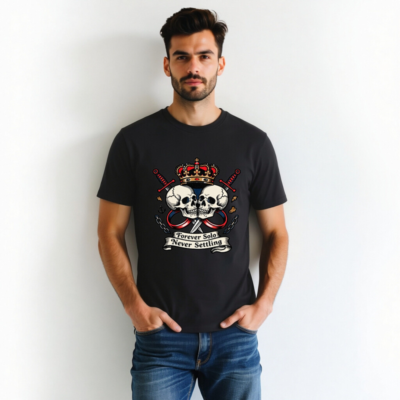 Show your unyielding spirit with this unisex organic cotton t-shirt featuring a bold skull, crown, and crossed swords design. The ‘Forever Solo Never Settling’ banner embodies resilience and independence. Crafted for comfort and sustainability, it’s made from certified organic cotton—no synthetic blends or harmful chemicals. Ideal for those who value authenticity, quality, and a striking statement piece.