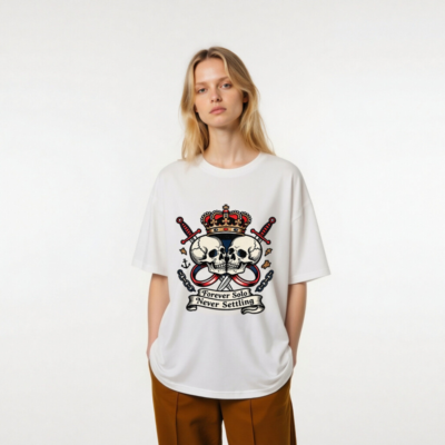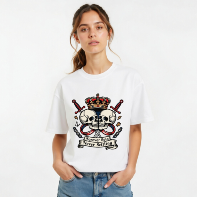 Premium unisex organic cotton t-shirt featuring a bold vintage-style design: two skulls, crossed swords, royal crown, anchor, and chains. The iconic ‘Forever Solo Never Settling’ banner adds rebellious flair. Soft, breathable fabric for all-day comfort. Sustainable choice—made with certified organic cotton. Ideal for those who value individuality and timeless style.