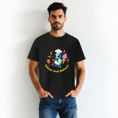 Unisex Organic Cotton T-Shirt | Galactic Grub Delivery Alien Chef Scooter Design