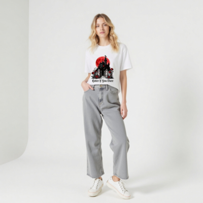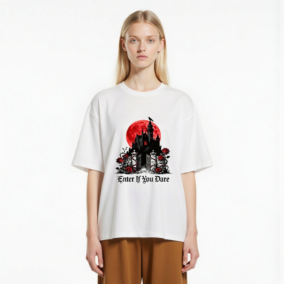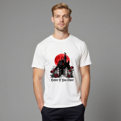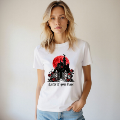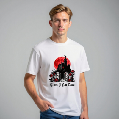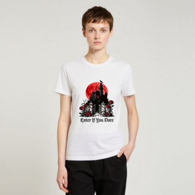 Wear the haunting charm of a gothic castle under a blood-red moon, adorned with crimson roses and a raven—this unisex organic cotton t-shirt blends dark fantasy art with ethical fashion. Soft, breathable, and eco-conscious, it’s crafted for comfort and style. Perfect for fans of horror, gothic aesthetics, or bold self-expression. The design features a striking ‘Enter If You Dare’ slogan, evoking mystery and adventure.