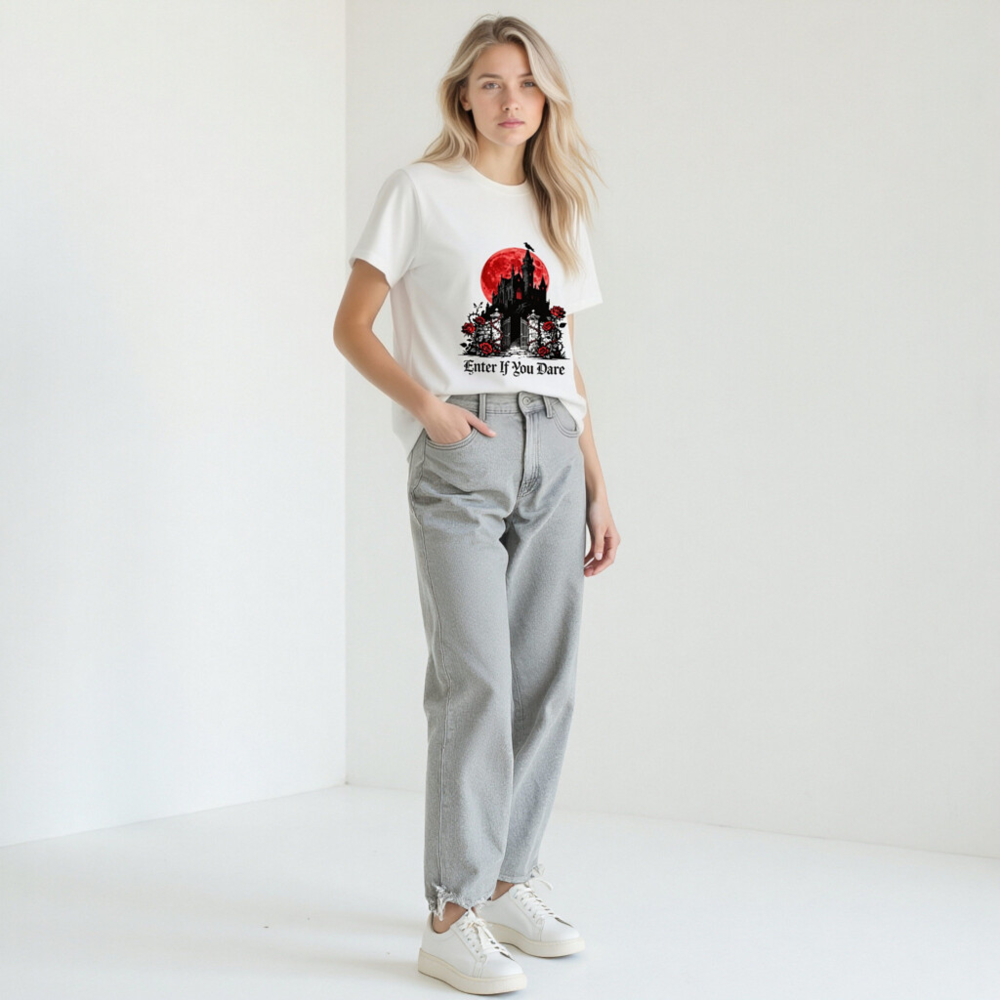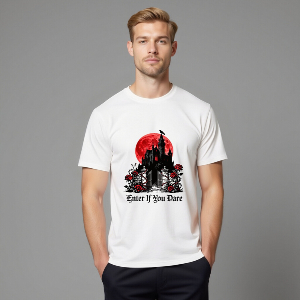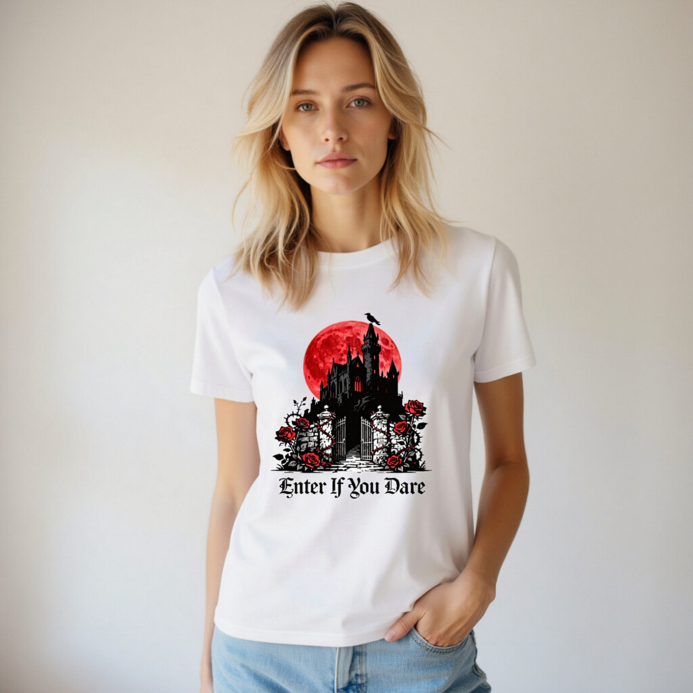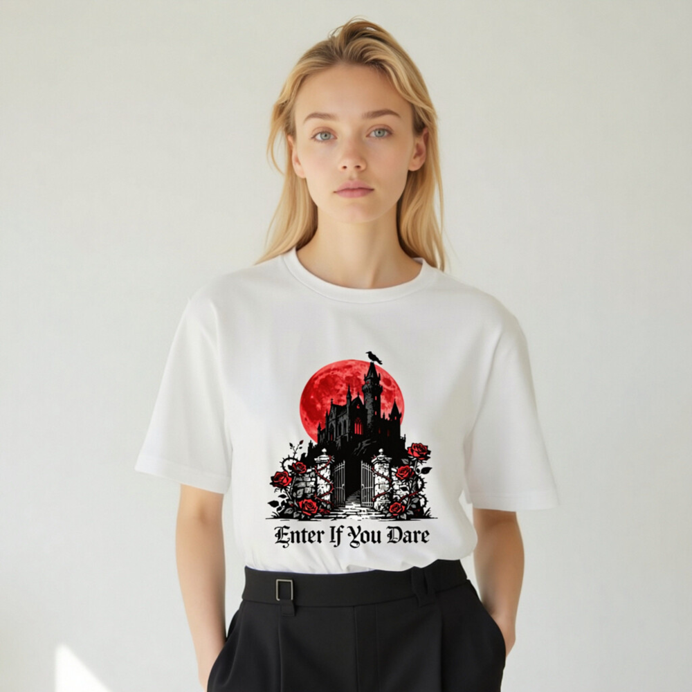 Unisex Organic Cotton T-Shirt – Gothic Castle & Red Moon Design, ‘Enter If You Dare’