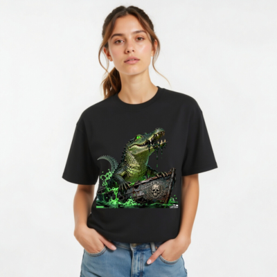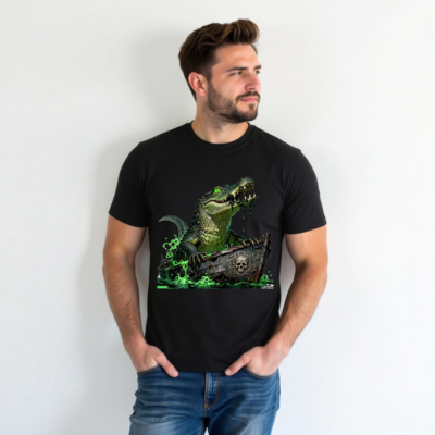 Wear this unisex organic cotton t-shirt featuring a vivid green crocodile with glowing eyes, emerging from a weathered pirate boat marked ‘Ferryman of the Styx’ and a skull. The design blends fantasy, horror, and humor with splashes of neon-green slime. Crafted for comfort and sustainability, it’s made from certified organic cotton—no synthetic additives or harmful dyes. Ideal for fans of dark fantasy, cryptozoology, and unique apparel. Size-friendly fit for all genders.