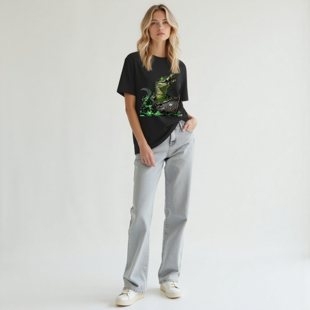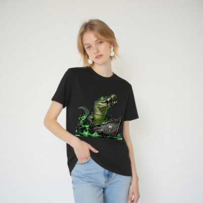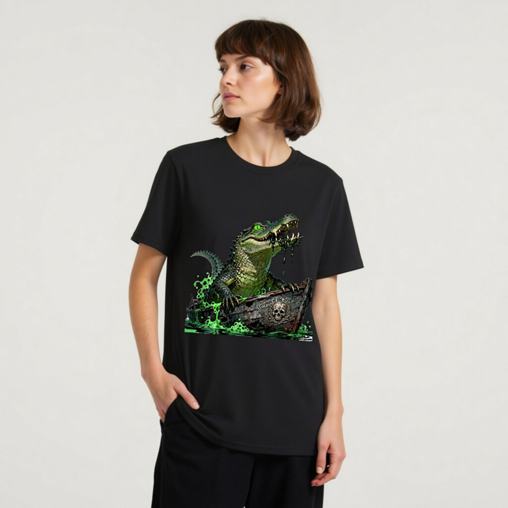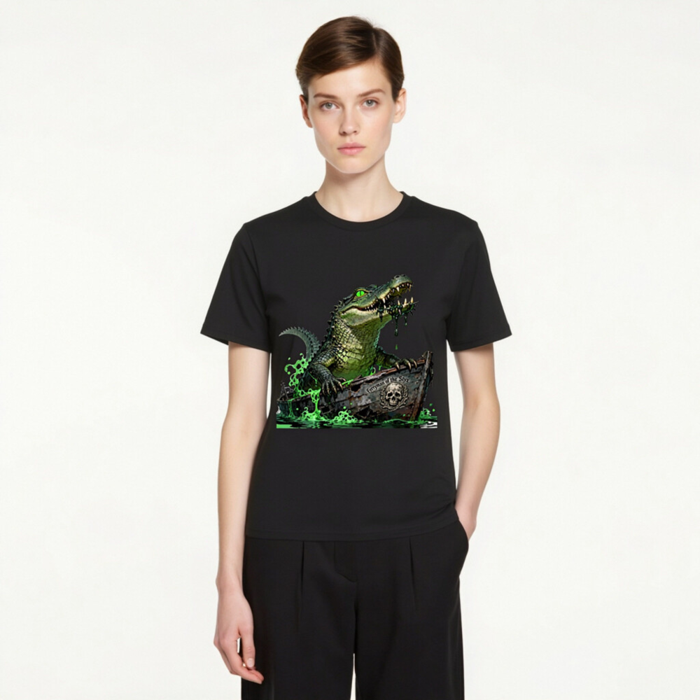 Wear this unisex organic cotton t-shirt featuring a vivid green crocodile with glowing eyes, emerging from a weathered pirate boat marked ‘Ferryman of the Styx’ and a skull. The design blends fantasy, horror, and humor with splashes of neon-green slime. Crafted for comfort and sustainability, it’s made from certified organic cotton—no synthetic additives or harmful dyes. Ideal for fans of dark fantasy, cryptozoology, and unique apparel. Size-friendly fit for all genders.