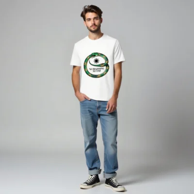Wear the ancient symbol of eternity: a vibrant green and gold ouroboros snake coiled around a sun motif, with the timeless phrase ‘NO BEGINNING NO END’. Crafted from unisex organic cotton for comfort and sustainability. Ideal for philosophy lovers, spiritual seekers, and those who appreciate symbolic art. Soft, breathable, and ethically made.