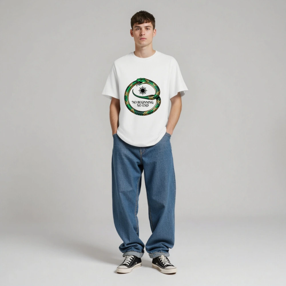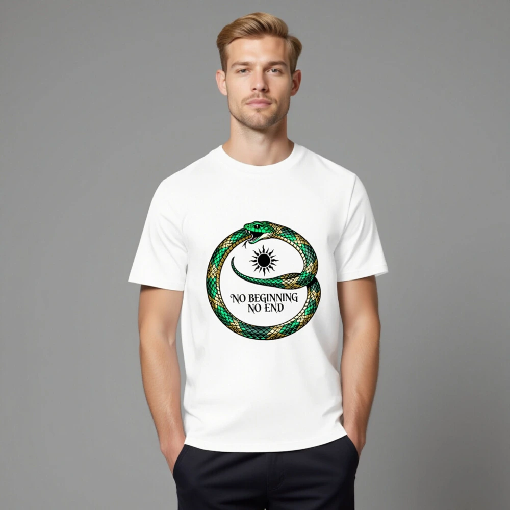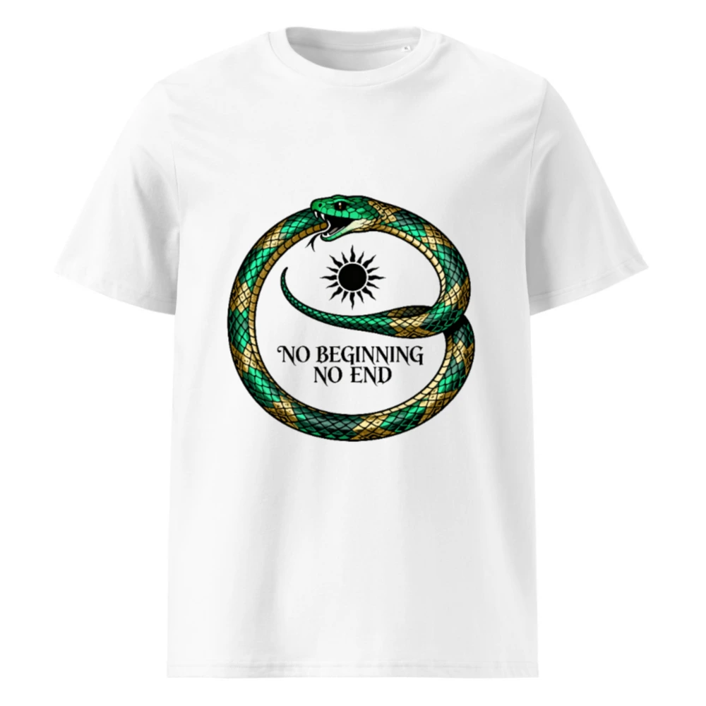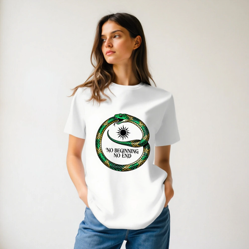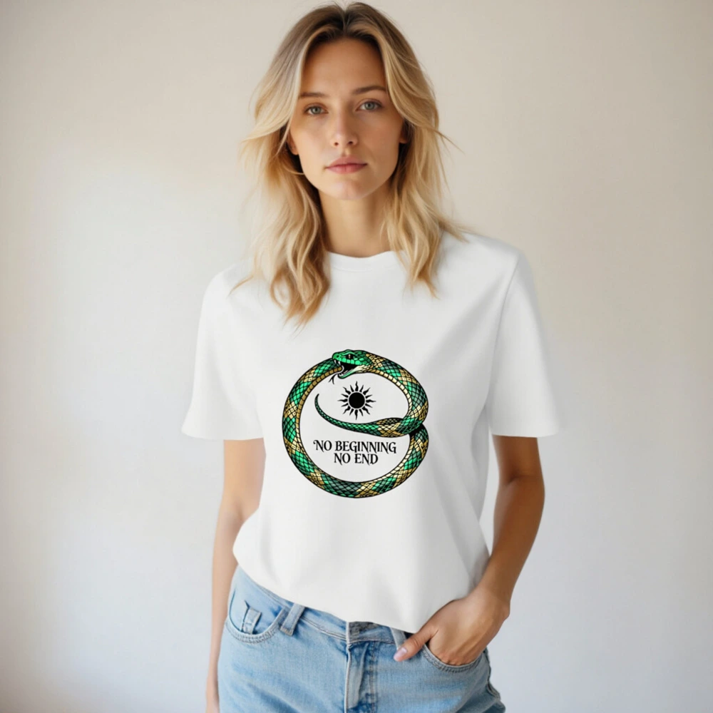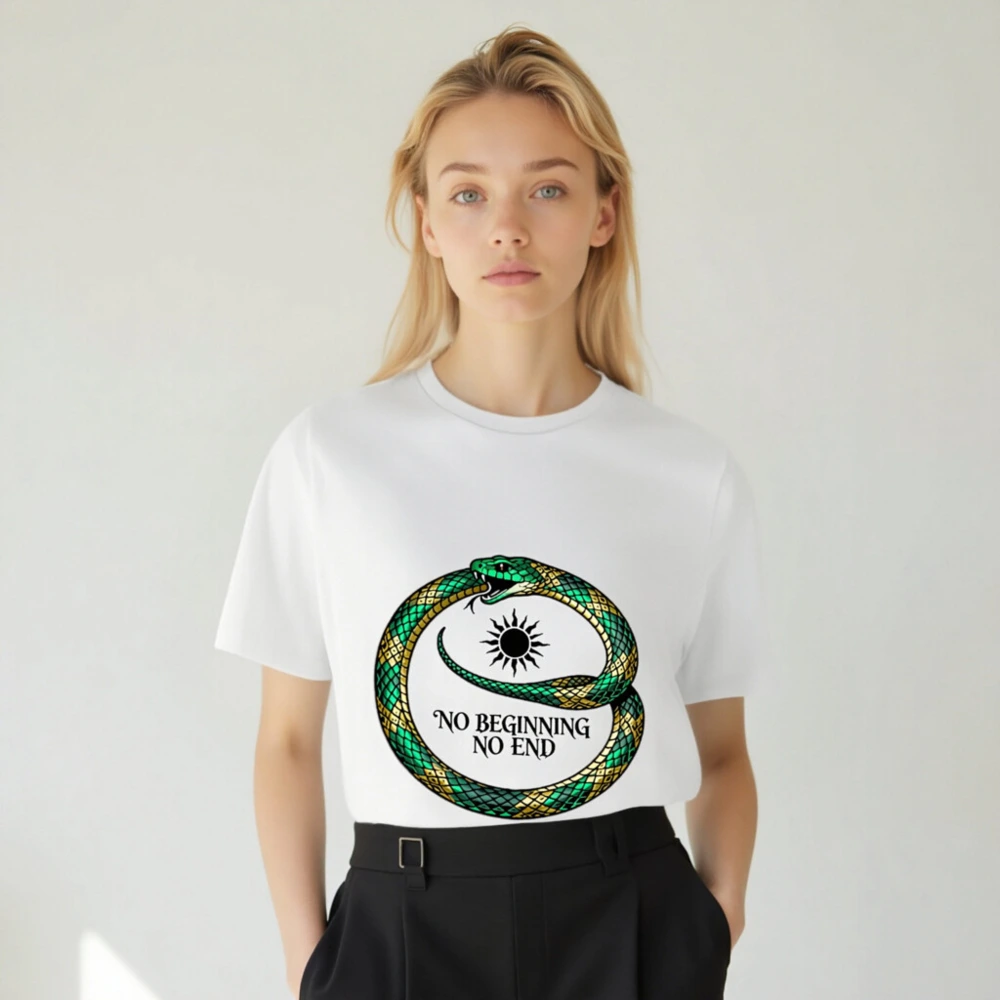 Wear the ancient symbol of eternity: a vibrant green and gold ouroboros snake coiled around a sun motif, with the timeless phrase ‘NO BEGINNING NO END’. Crafted from unisex organic cotton for comfort and sustainability. Ideal for philosophy lovers, spiritual seekers, and those who appreciate symbolic art. Soft, breathable, and ethically made.