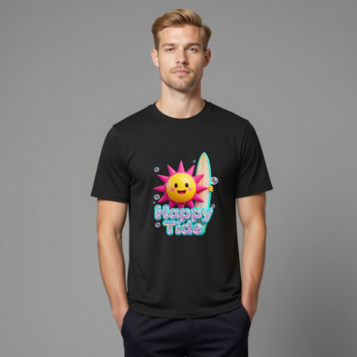 Bright, playful unisex organic cotton t-shirt featuring a cheerful pink-spiked sun holding a surfboard with ‘Happy Tide’ text and bubbles. Soft, sustainable fabric for comfort and eco-conscious style. Perfect for beach lovers and casual wear. Made from certified organic cotton — no synthetic additives or harmful dyes.