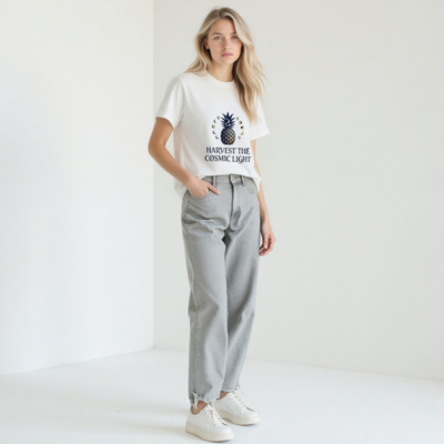 A unisex organic cotton t-shirt featuring a cosmic pineapple design with moon phases and celestial motifs. Soft, sustainable fabric for everyday comfort. Ethically made with certified organic cotton—no synthetic additives or harmful dyes. Ideal for cosmic lovers, dreamers, and eco-conscious fashionistas seeking meaningful style.
