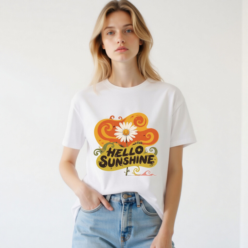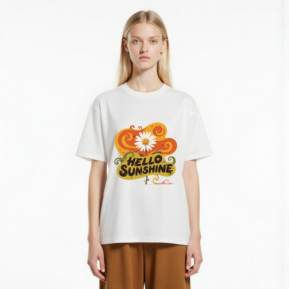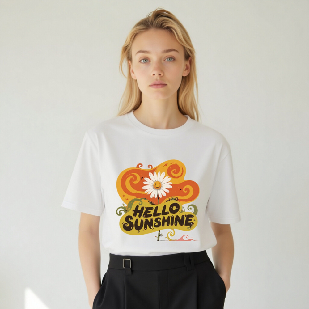 Soft, eco-friendly unisex t-shirt made from organic cotton. Features a cheerful ‘Hello Sunshine’ design with a smiling daisy and vibrant swirls—perfect for uplifting your everyday style. Comfortable, sustainable, and proudly made for all genders.
