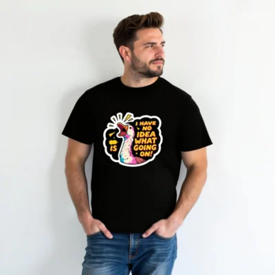 This unisex organic cotton t-shirt features a vibrant, cartoon-style duck with bold text ‘I HAVE NO IDEA WHAT GOING ON!’—perfect for expressing playful confusion. Made from certified organic cotton for comfort and sustainability. Gender-neutral fit, soft fabric, and eye-catching design ideal for casual wear. A fun statement piece that combines humor with eco-conscious values.