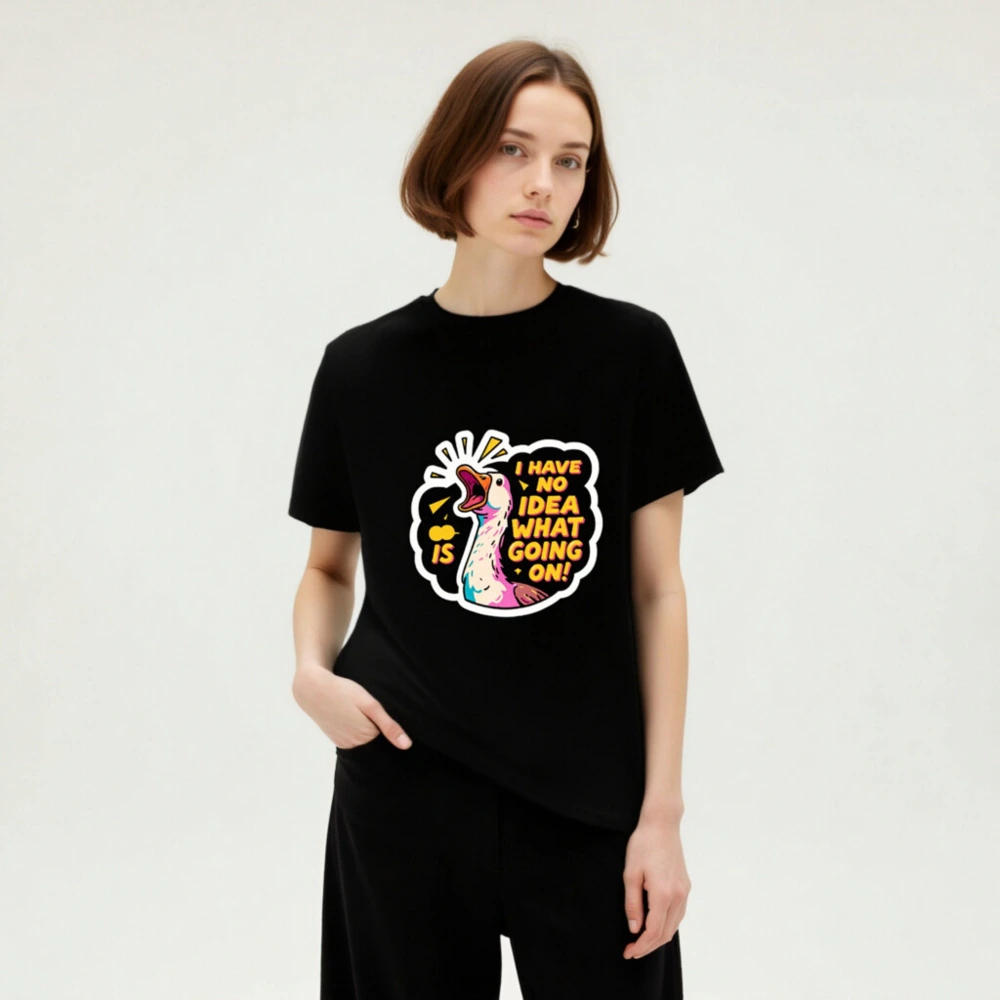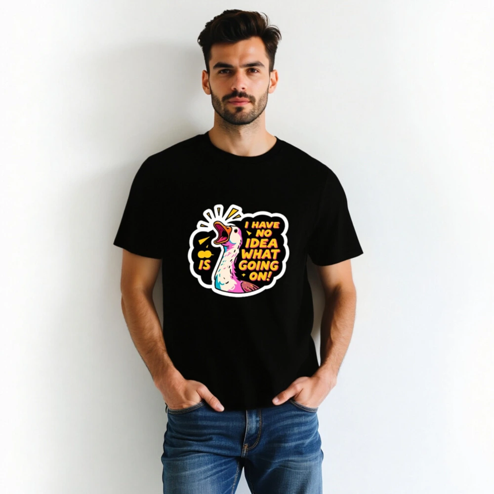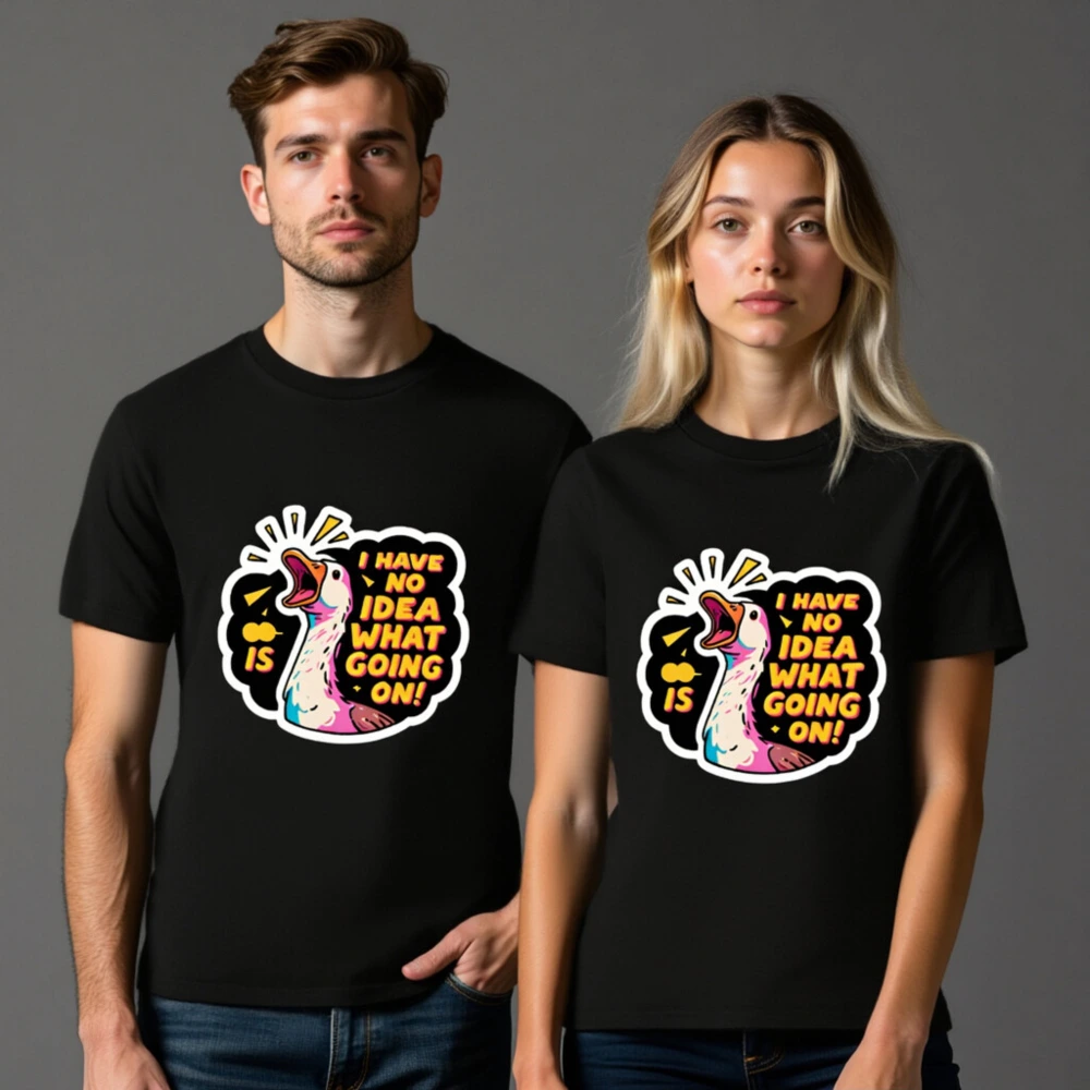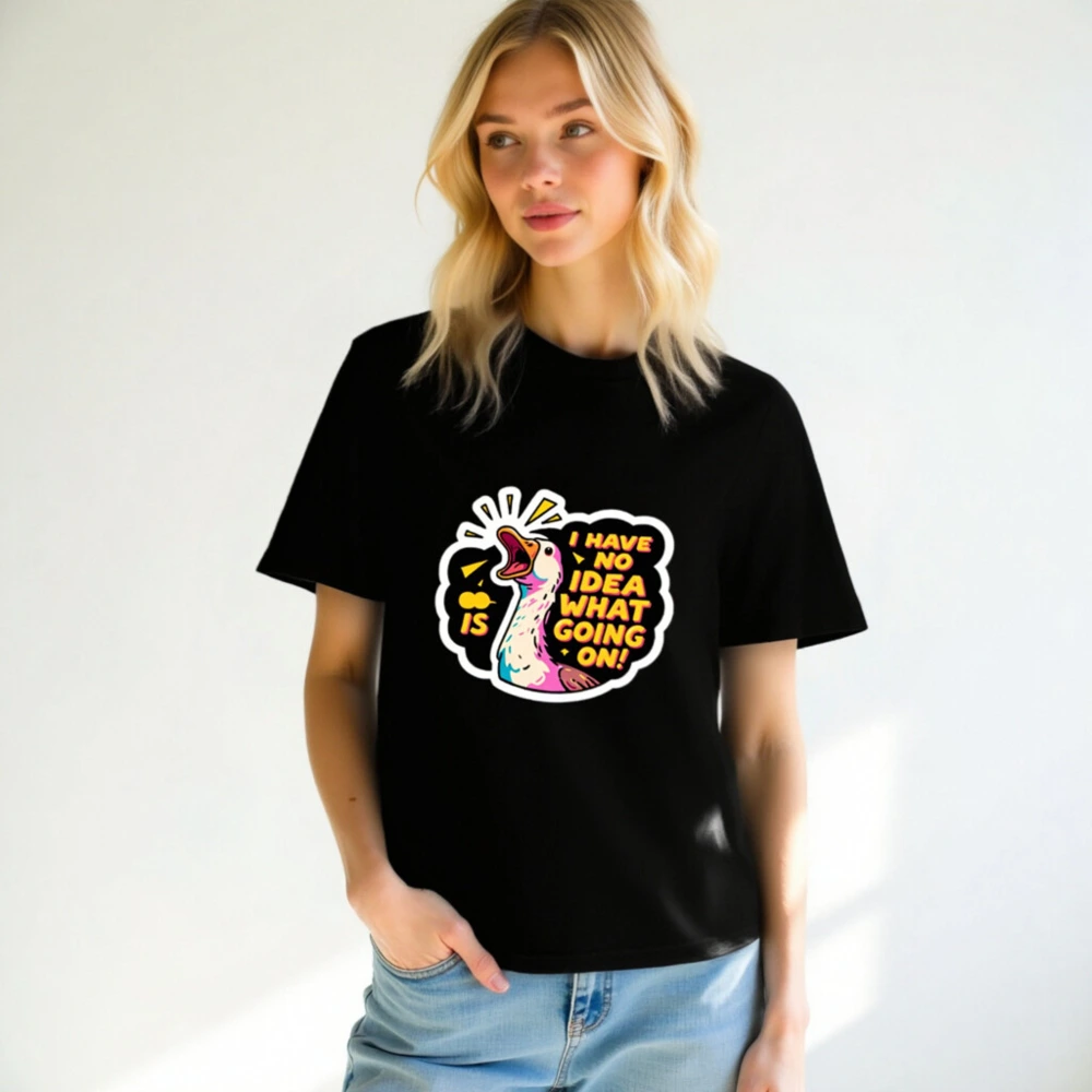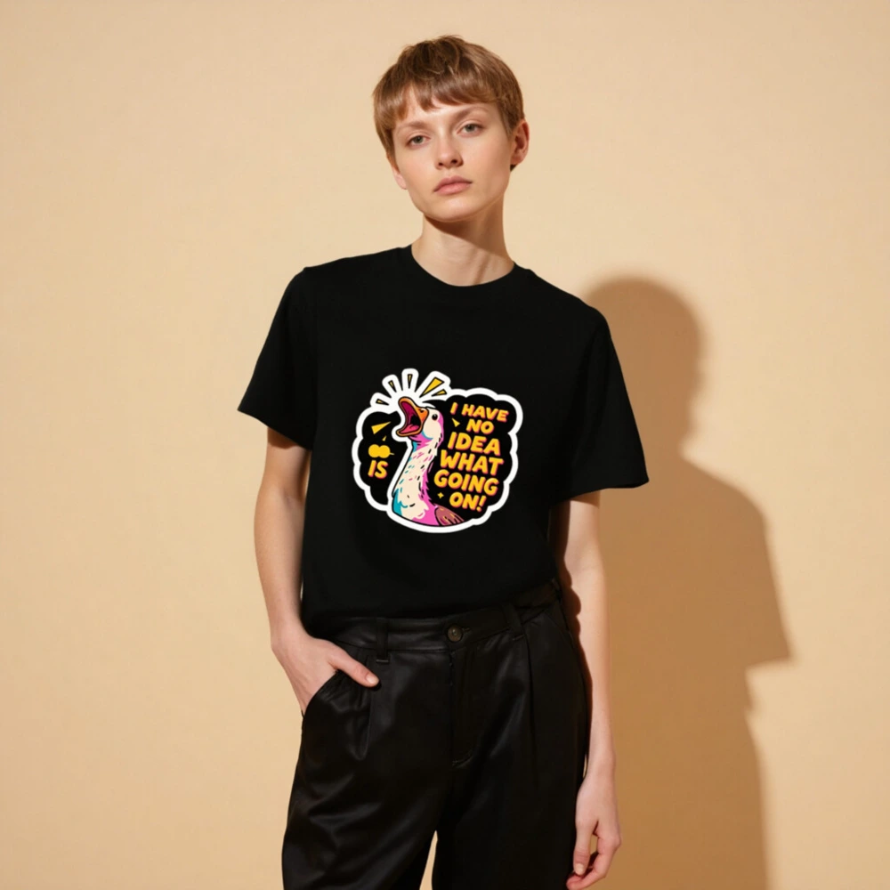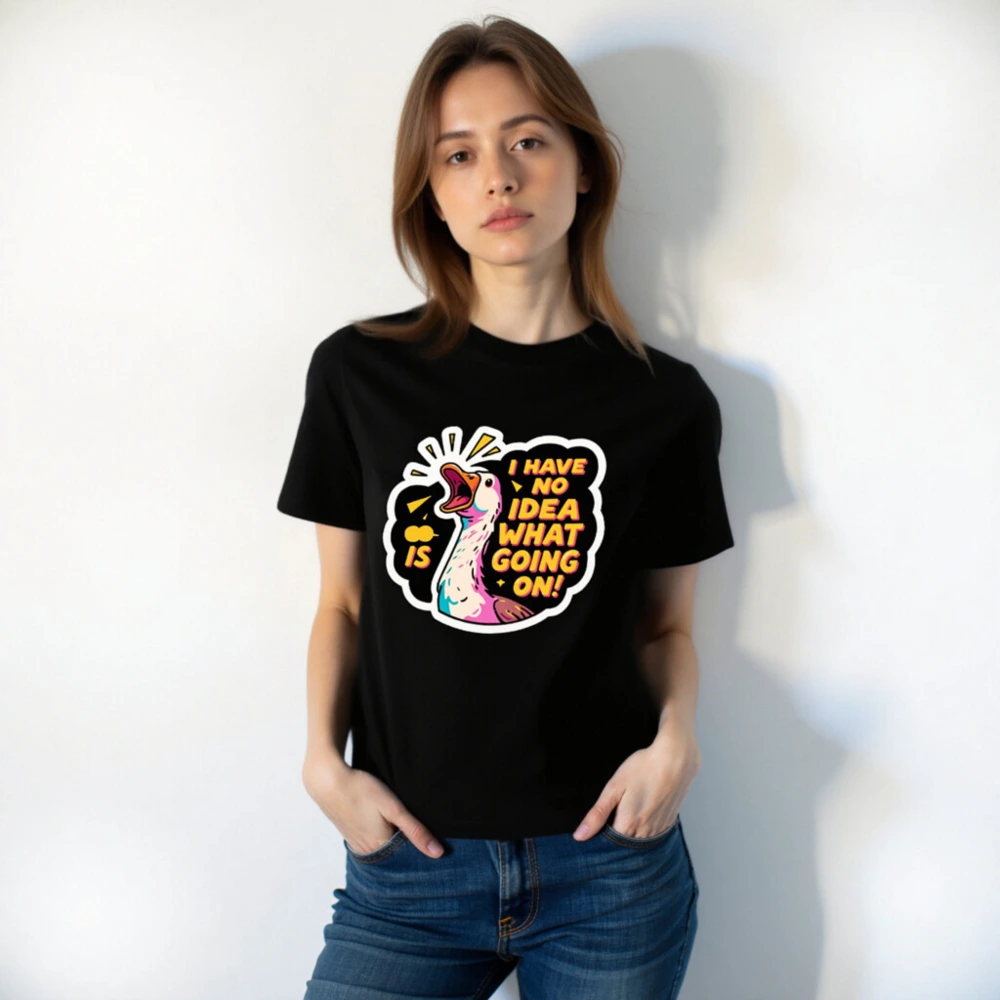 This unisex organic cotton t-shirt features a vibrant, cartoon-style duck with bold text ‘I HAVE NO IDEA WHAT GOING ON!’—perfect for expressing playful confusion. Made from certified organic cotton for comfort and sustainability. Gender-neutral fit, soft fabric, and eye-catching design ideal for casual wear. A fun statement piece that combines humor with eco-conscious values.