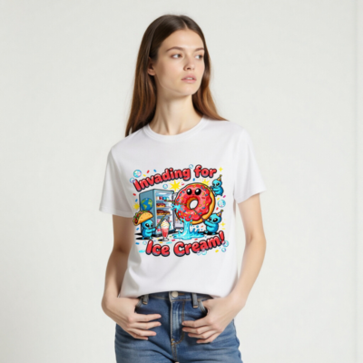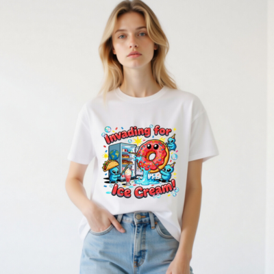 A playful unisex organic cotton t-shirt featuring a whimsical alien invasion theme centered around ice cream—complete with a smiling pink donut, party-hat-wearing aliens, and a fridge full of treats. Soft, breathable, and eco-conscious, this fun design appeals to fans of quirky humor and pop culture. Perfect for casual wear or gifting. Made with certified organic cotton (verified by GOTS standard).