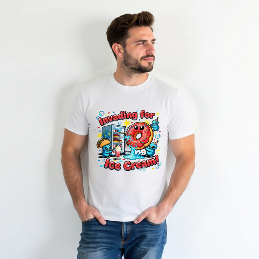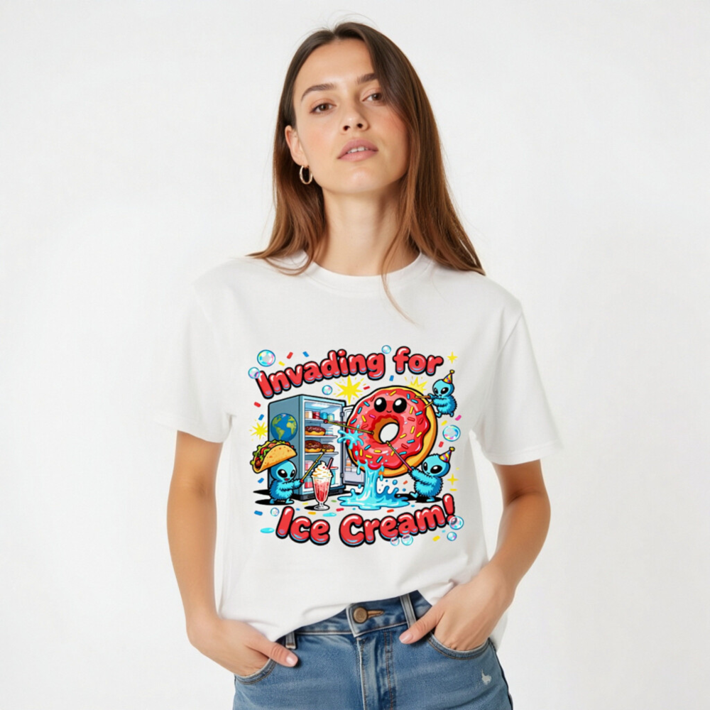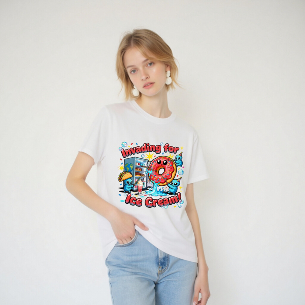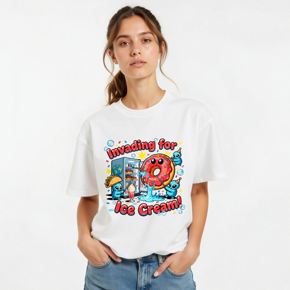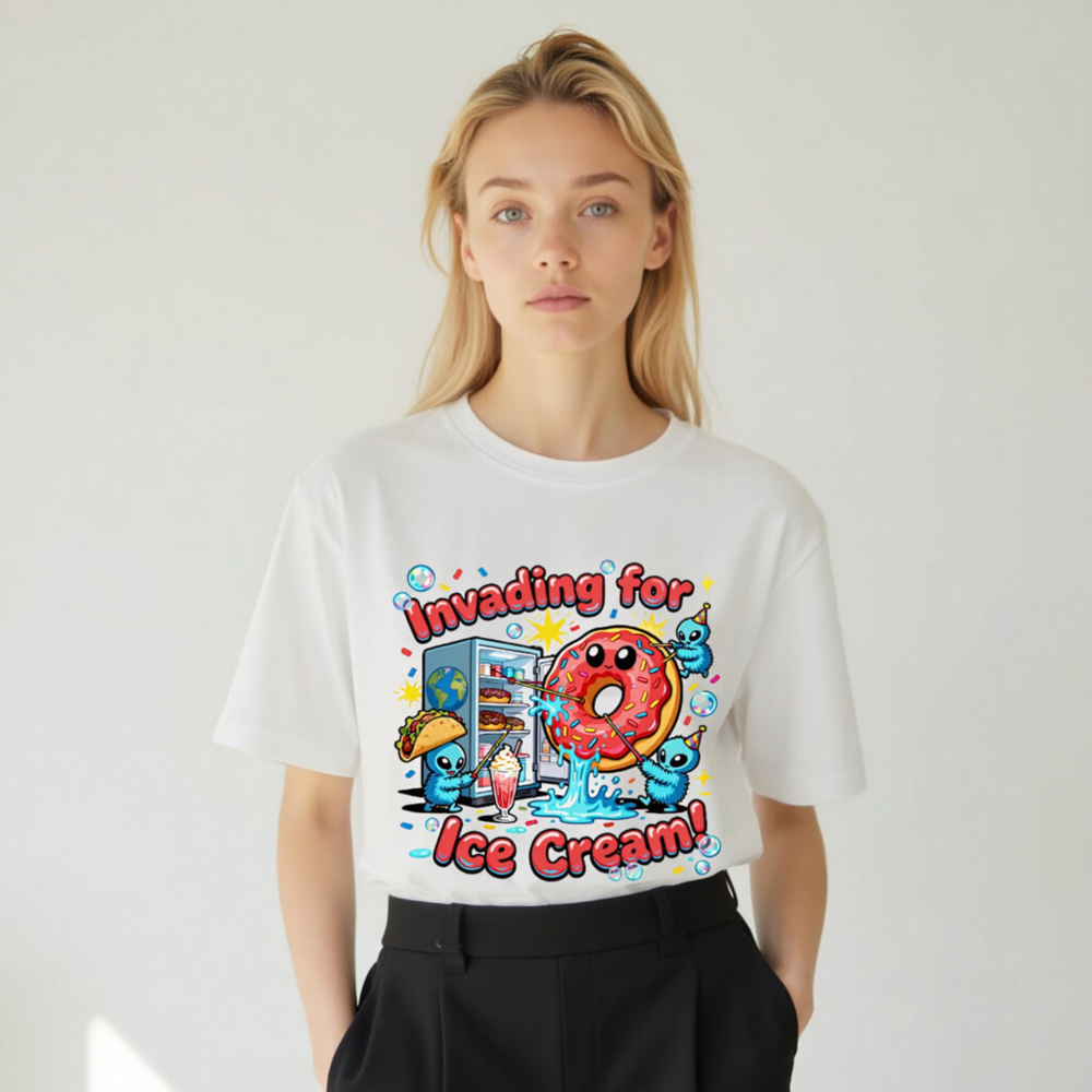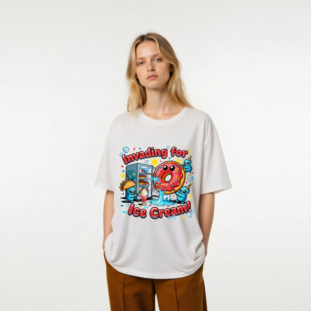 A playful unisex organic cotton t-shirt featuring a whimsical alien invasion theme centered around ice cream—complete with a smiling pink donut, party-hat-wearing aliens, and a fridge full of treats. Soft, breathable, and eco-conscious, this fun design appeals to fans of quirky humor and pop culture. Perfect for casual wear or gifting. Made with certified organic cotton (verified by GOTS standard).