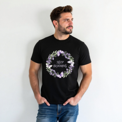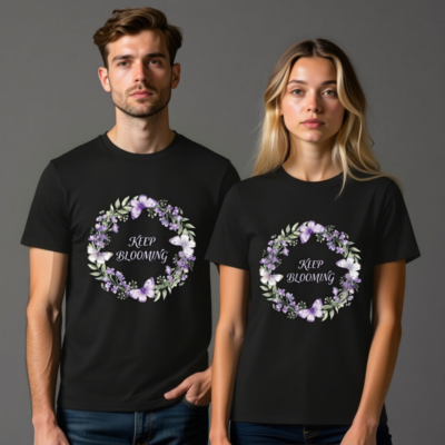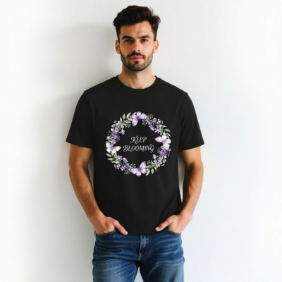 This unisex organic cotton t-shirt features a beautiful purple floral wreath with butterflies and the uplifting message ‘Keep Blooming’. Crafted for comfort and sustainability, it’s made from certified organic cotton — soft, breathable, and gentle on skin. Ideal for everyday wear or gifting. The design blends nature-inspired art with motivational positivity. Perfect for eco-conscious shoppers seeking quality, style, and ethical fashion.