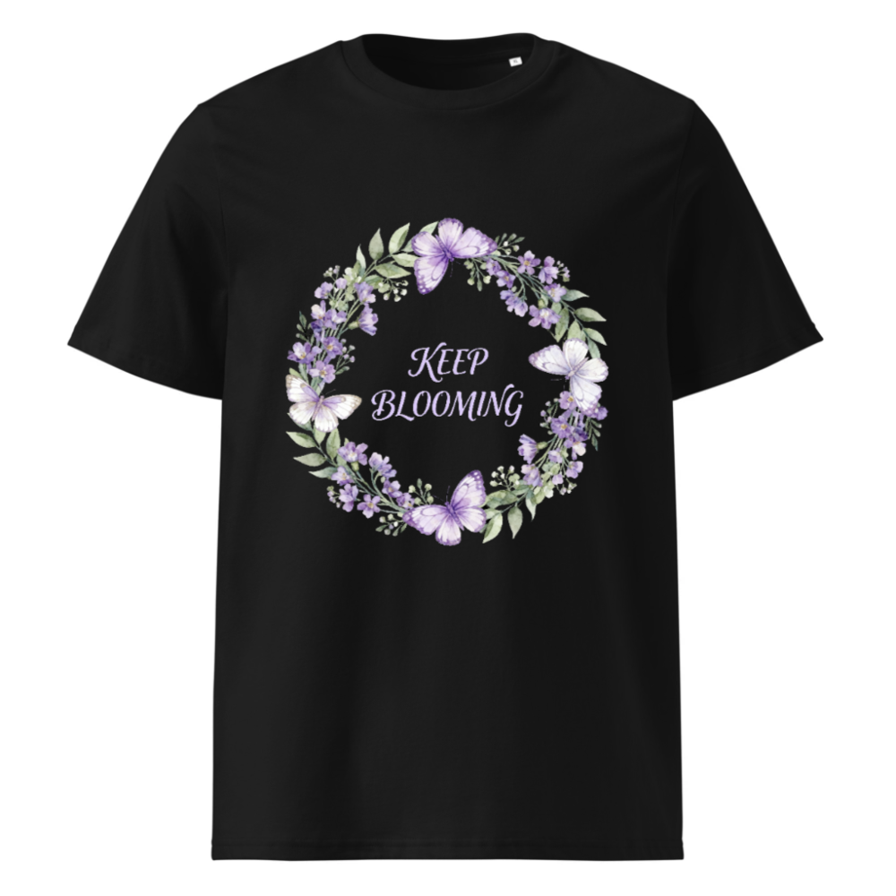 Unisex Organic Cotton T-Shirt | Keep Blooming Purple Flower & Butterfly Design