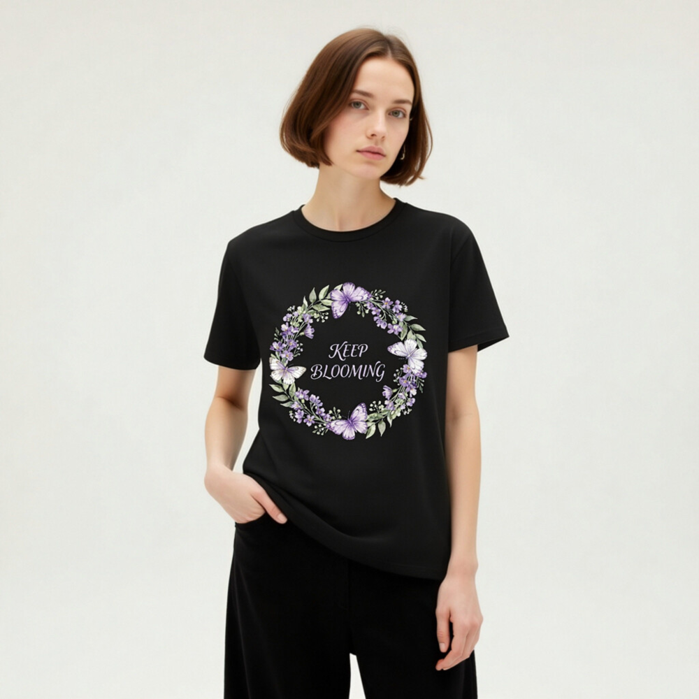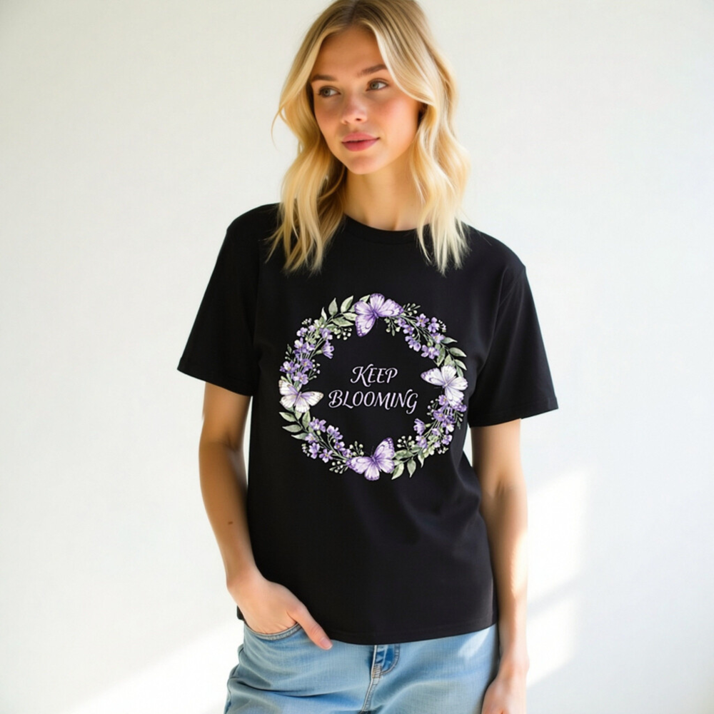 This unisex organic cotton t-shirt features a beautiful purple floral wreath with butterflies and the uplifting message ‘Keep Blooming’. Crafted for comfort and sustainability, it’s made from certified organic cotton — soft, breathable, and gentle on skin. Ideal for everyday wear or gifting. The design blends nature-inspired art with motivational positivity. Perfect for eco-conscious shoppers seeking quality, style, and ethical fashion.