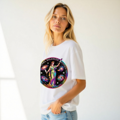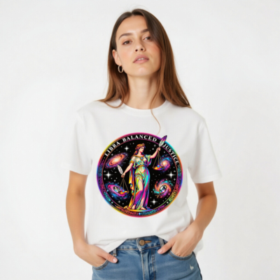 Wear cosmic justice with this unisex organic cotton t-shirt featuring a vibrant, rainbow-hued Lady Justice holding scales and a feather against a starry galaxy backdrop. ‘Libra Balanced Justice’ encircles the design—symbolizing harmony, fairness, and celestial wisdom. Made from certified organic cotton for comfort and sustainability. Ideal for astrology lovers, zodiac enthusiasts, and advocates of balance. Soft, breathable, and ethically crafted.