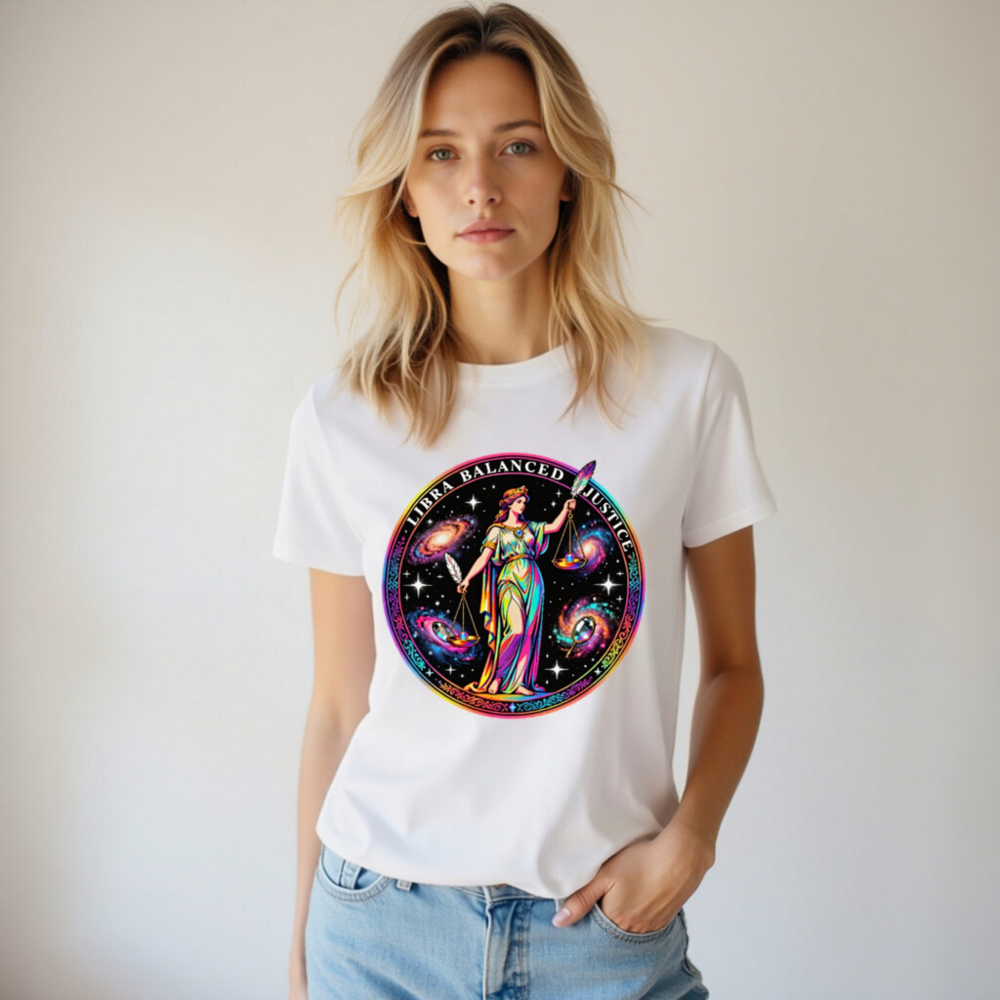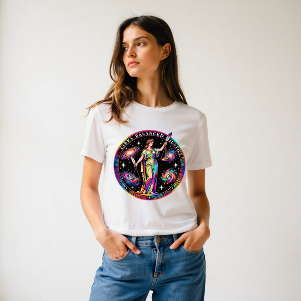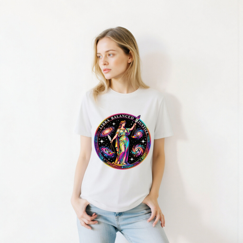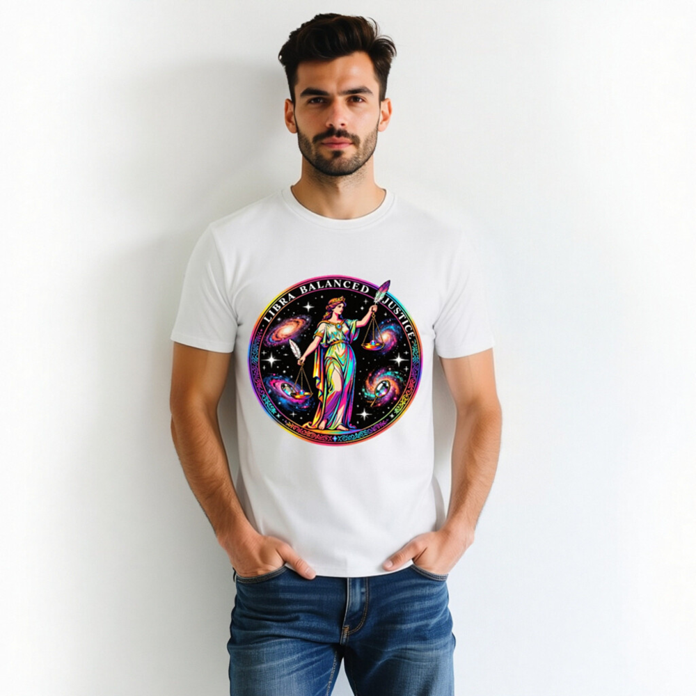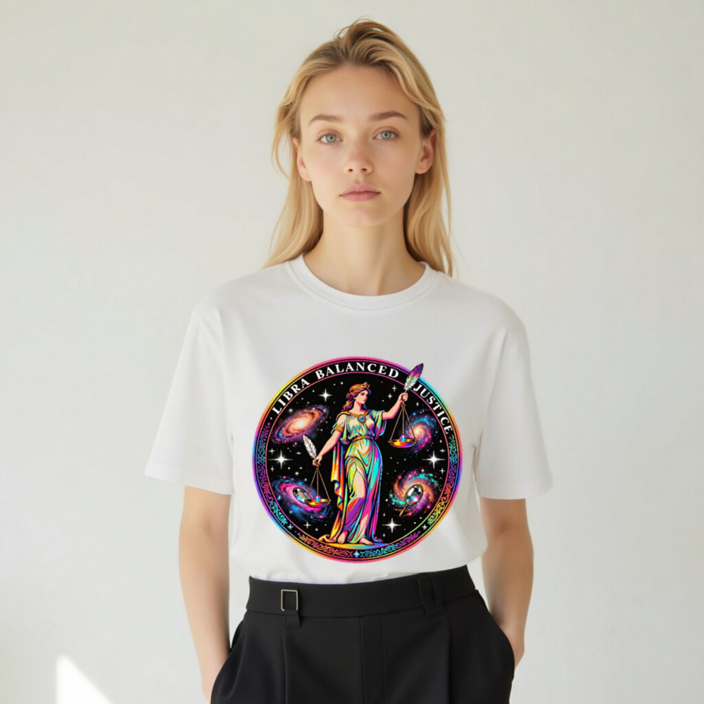 Wear cosmic justice with this unisex organic cotton t-shirt featuring a vibrant, rainbow-hued Lady Justice holding scales and a feather against a starry galaxy backdrop. ‘Libra Balanced Justice’ encircles the design—symbolizing harmony, fairness, and celestial wisdom. Made from certified organic cotton for comfort and sustainability. Ideal for astrology lovers, zodiac enthusiasts, and advocates of balance. Soft, breathable, and ethically crafted.